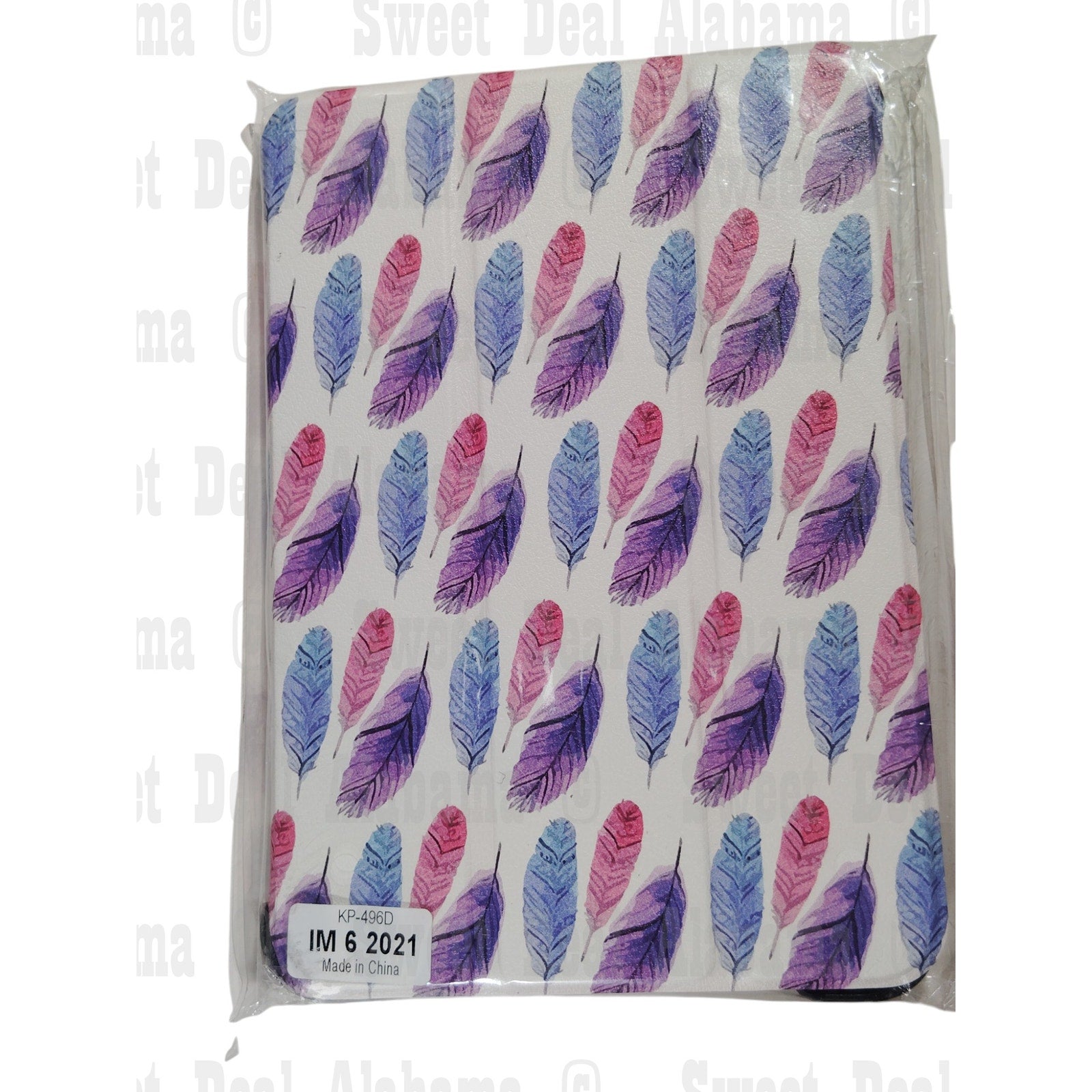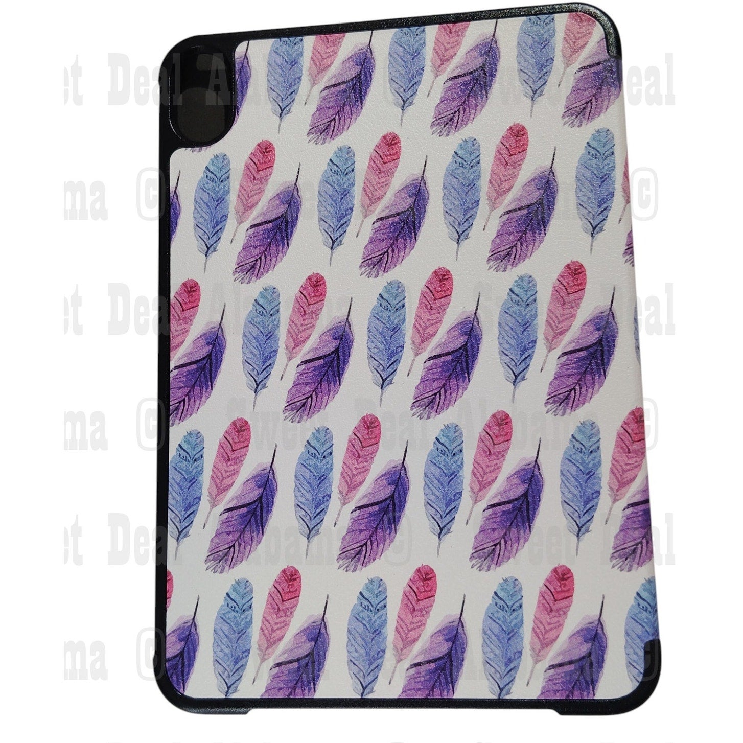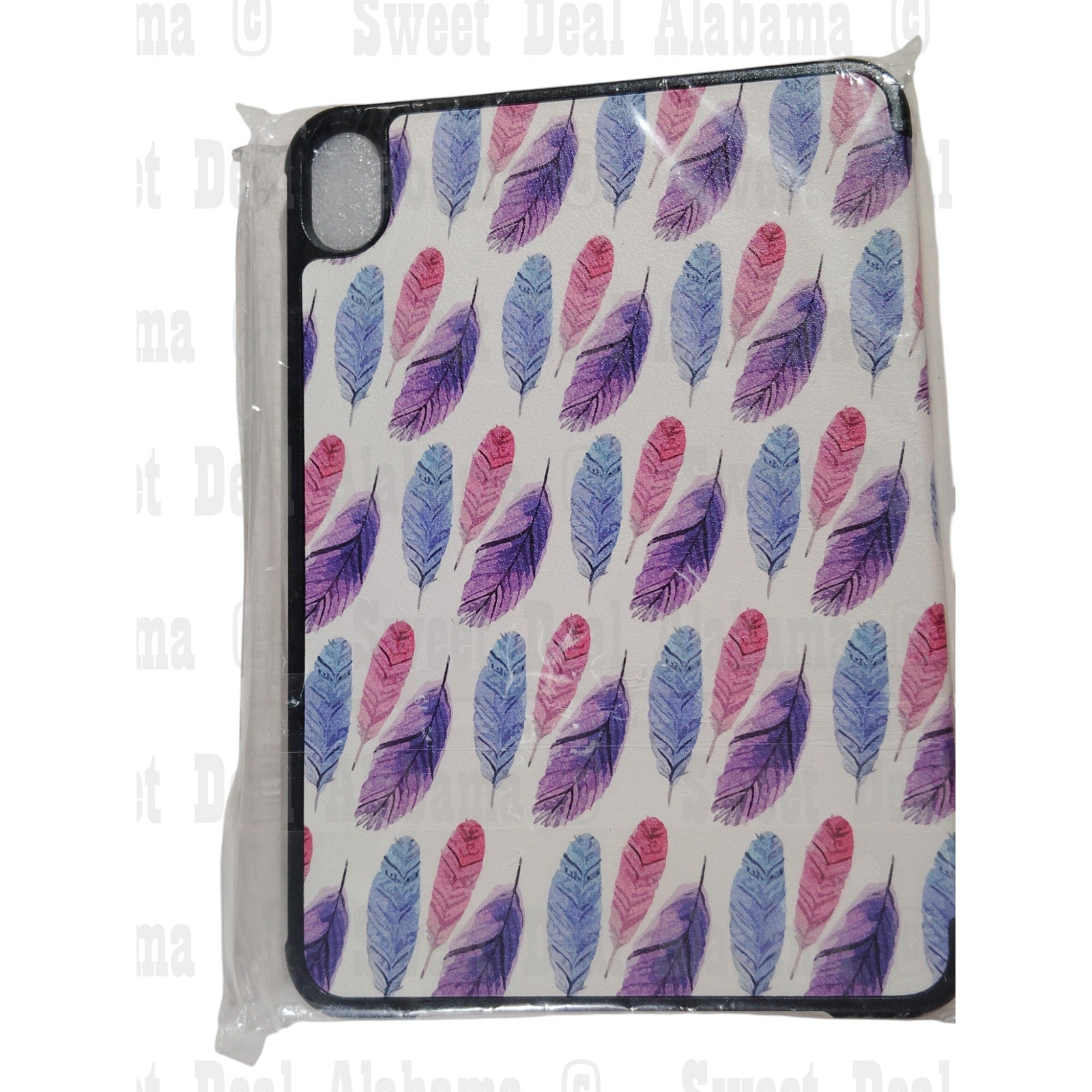 This tablet case is designed for the iPad Mini (2021, 6th Generation) and features a feather graphic pattern in shades of blue, purple, and pink. The white background enhances the vibrancy of the feathers, creating a stylish and artistic look. The case includes a cutout in the top left corner, likely for the camera, ensuring compatibility with the device.