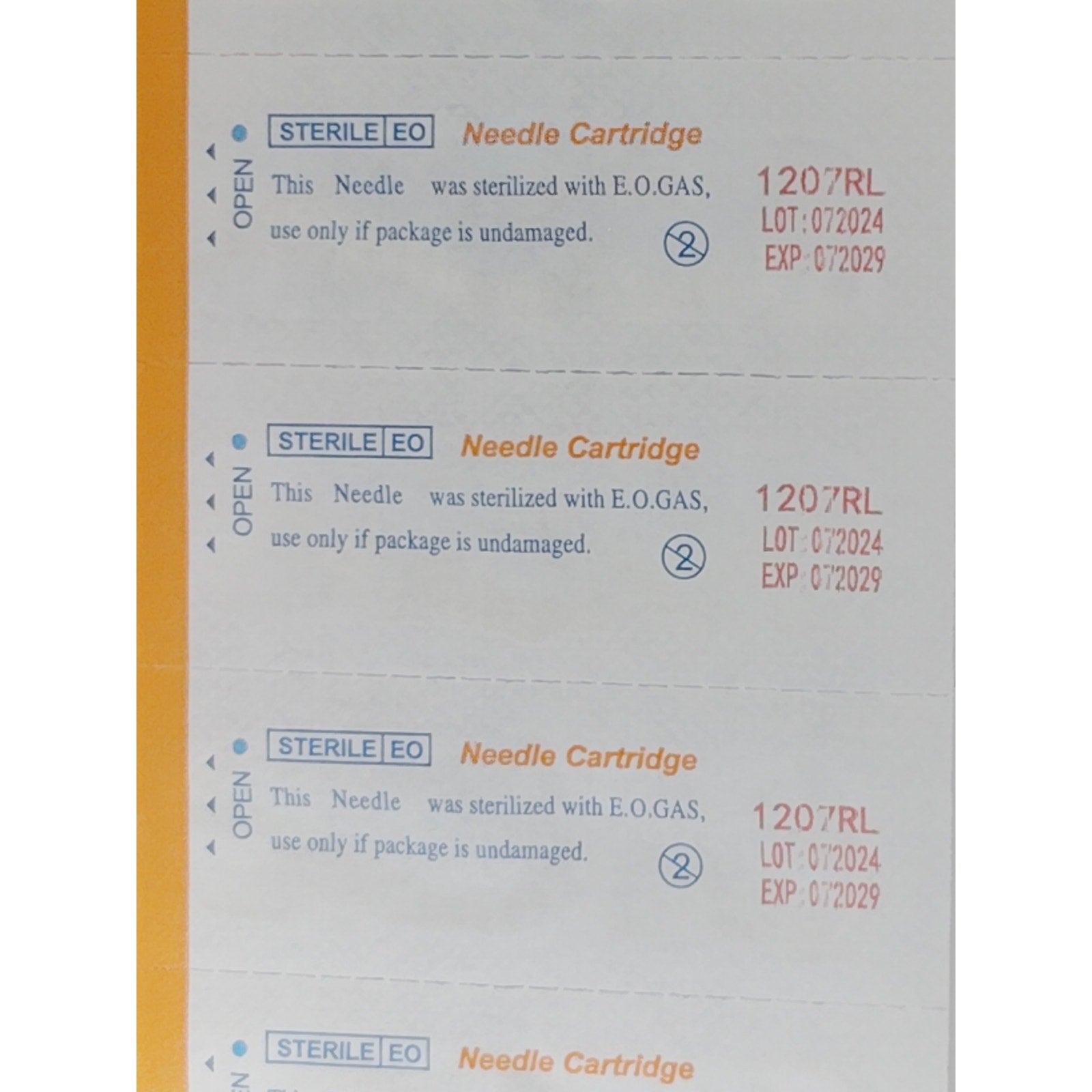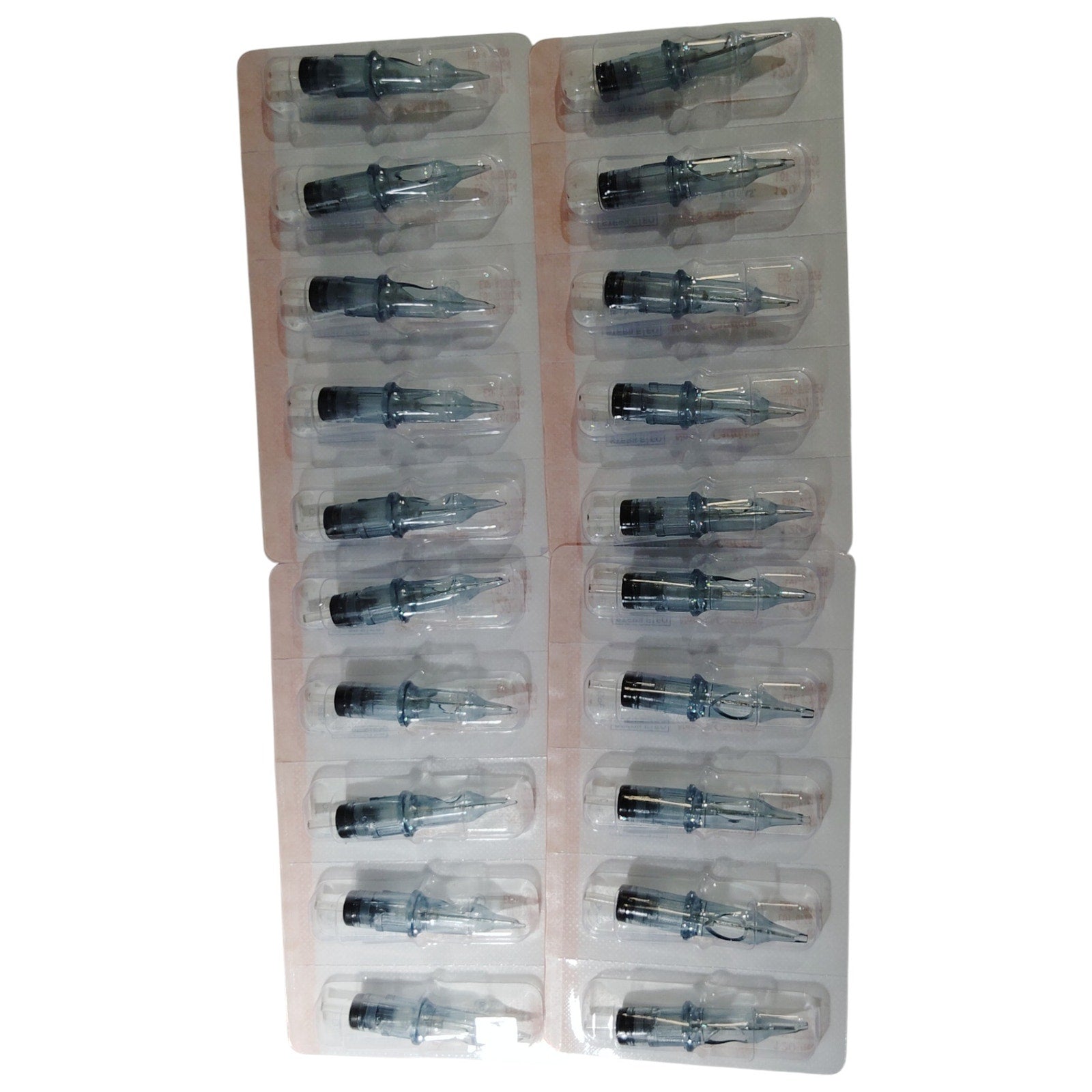 Assorted set of 50 professional tattoo needle cartridges, featuring 10 configurations with 5 pieces each. Includes round liners (RL), round shaders (RS), magnums (M1), and round magnums (RM) for versatile application across lining, shading, and color packing. Each cartridge is EO gas sterilized, individually blister-packed, and compatible with most rotary and coil tattoo machines. Expiration date: July 2029.