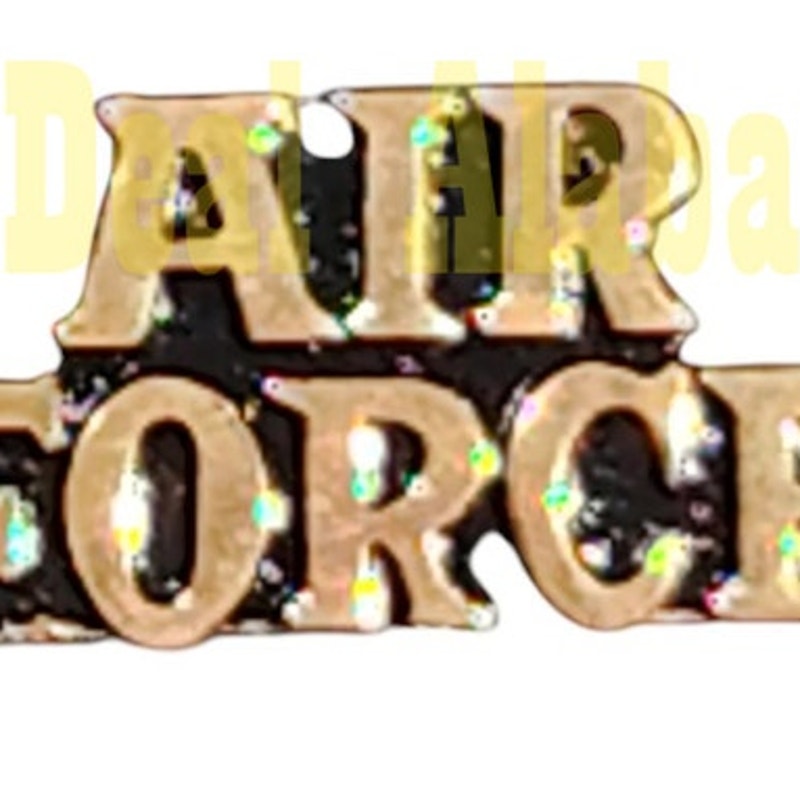 The Air Force in Text Hat, Lapel, or Collectors Pin is a compact military insignia featuring the words "AIR FORCE" in bold, uppercase lettering. Measuring 1" in width by 9/16" in height, this pin is designed for hats, lapels, jackets, or bags, serving as a tribute to the U.S. Air Force.