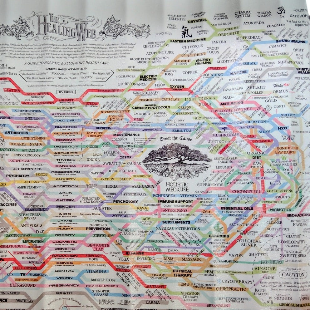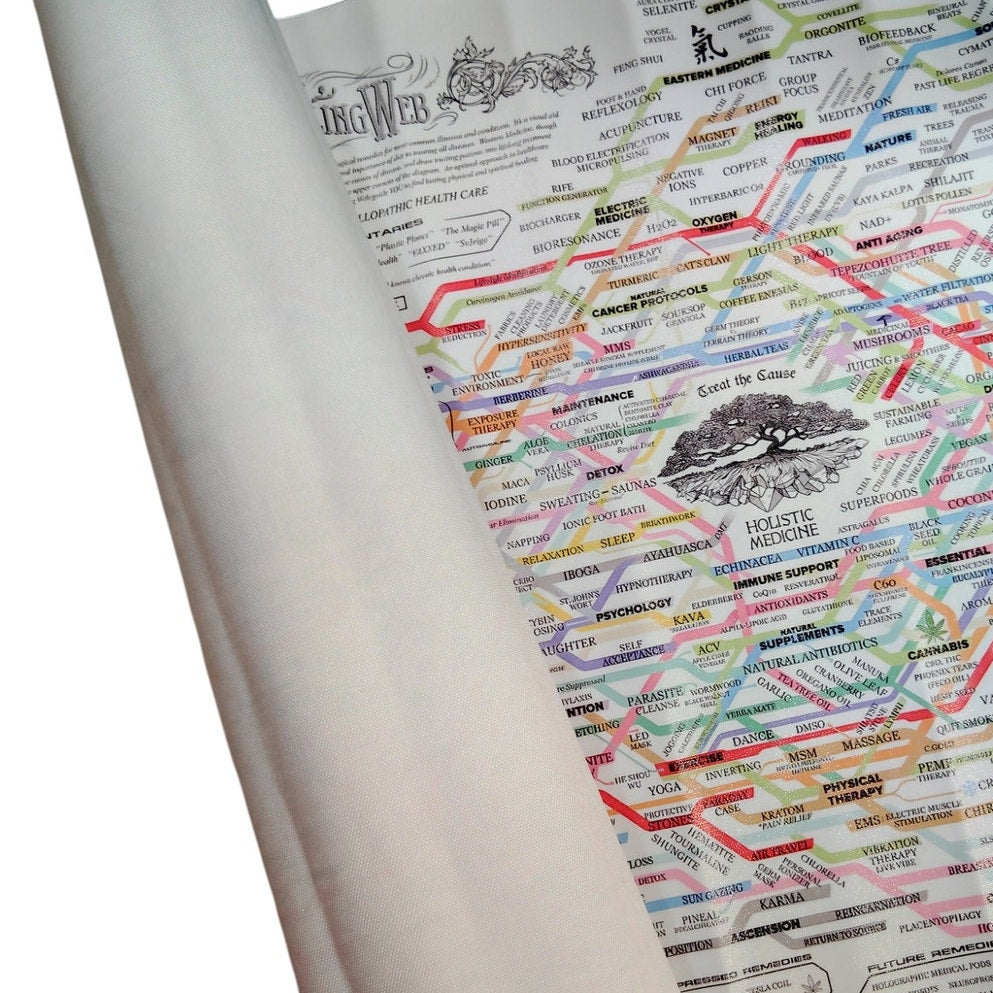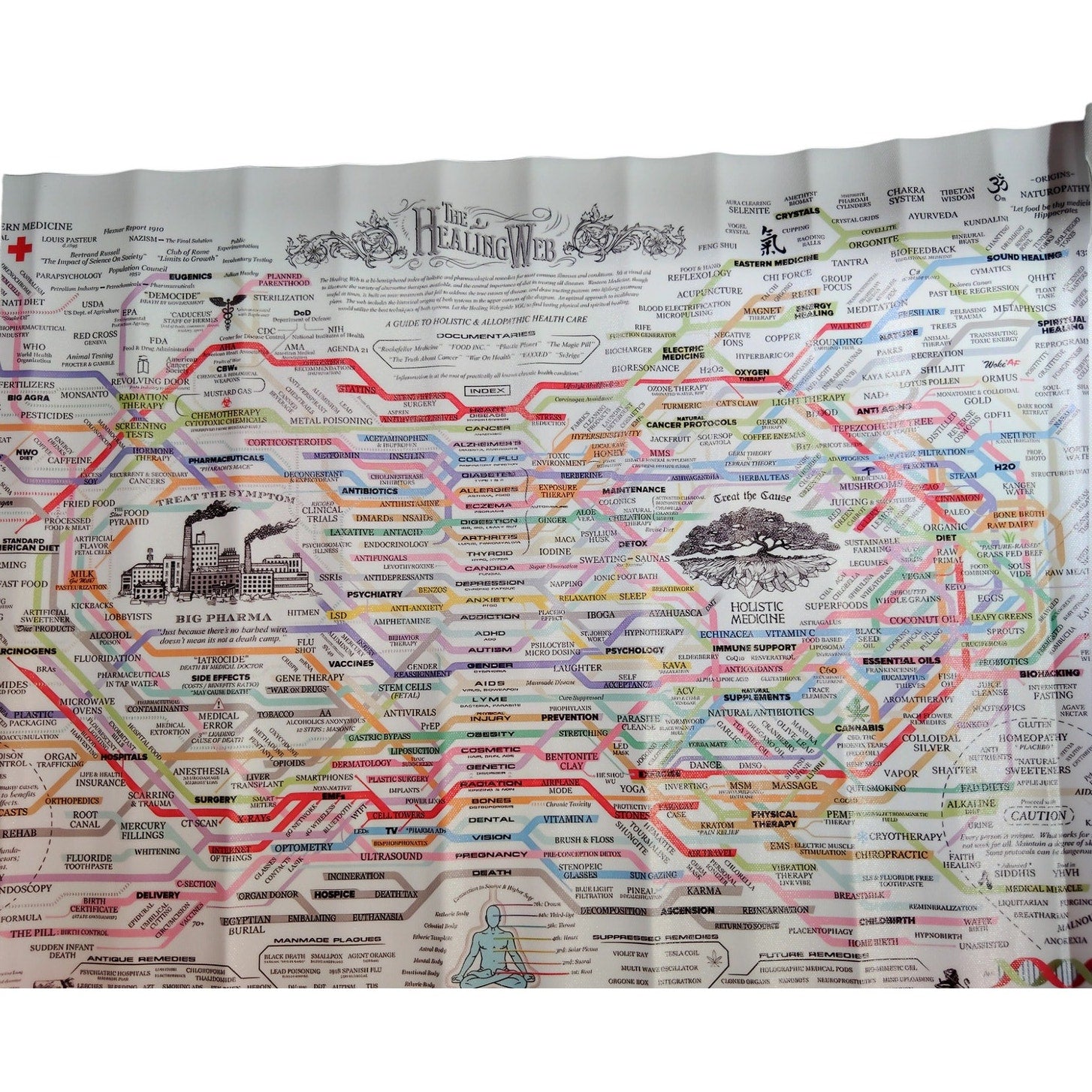 Educational and visually compelling canvas wall art featuring “The Healing Web,” a comprehensive chart mapping holistic and allopathic health care systems. This 24" x 16" unframed horizontal print presents a bi-hemisphered infographic of natural remedies, chronic conditions, pharmaceutical pathways, and spiritual healing modalities. Designed with vibrant node clusters and symbolic illustrations, it serves as both a decorative and informative piece for wellness spaces, therapy offices, or personal study.