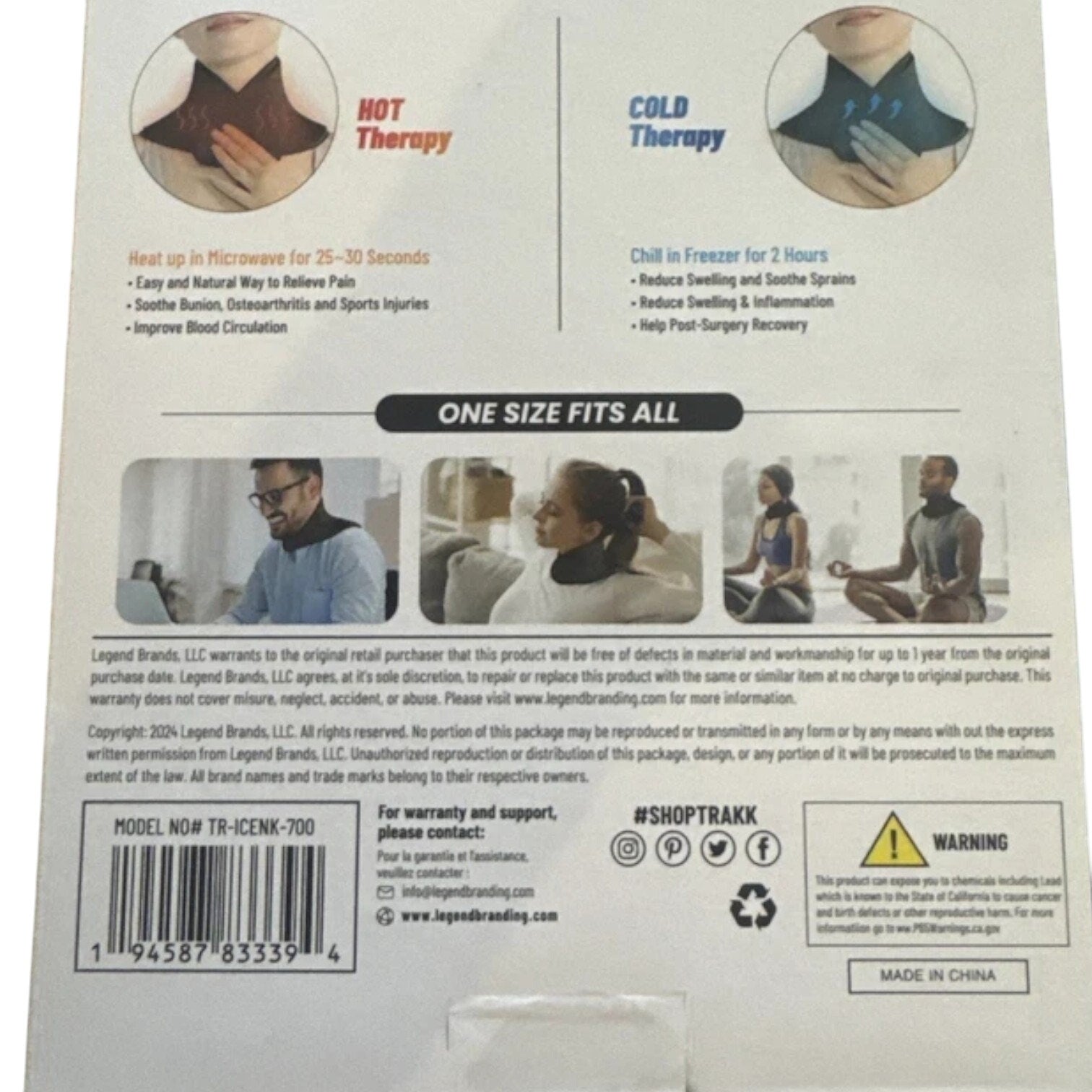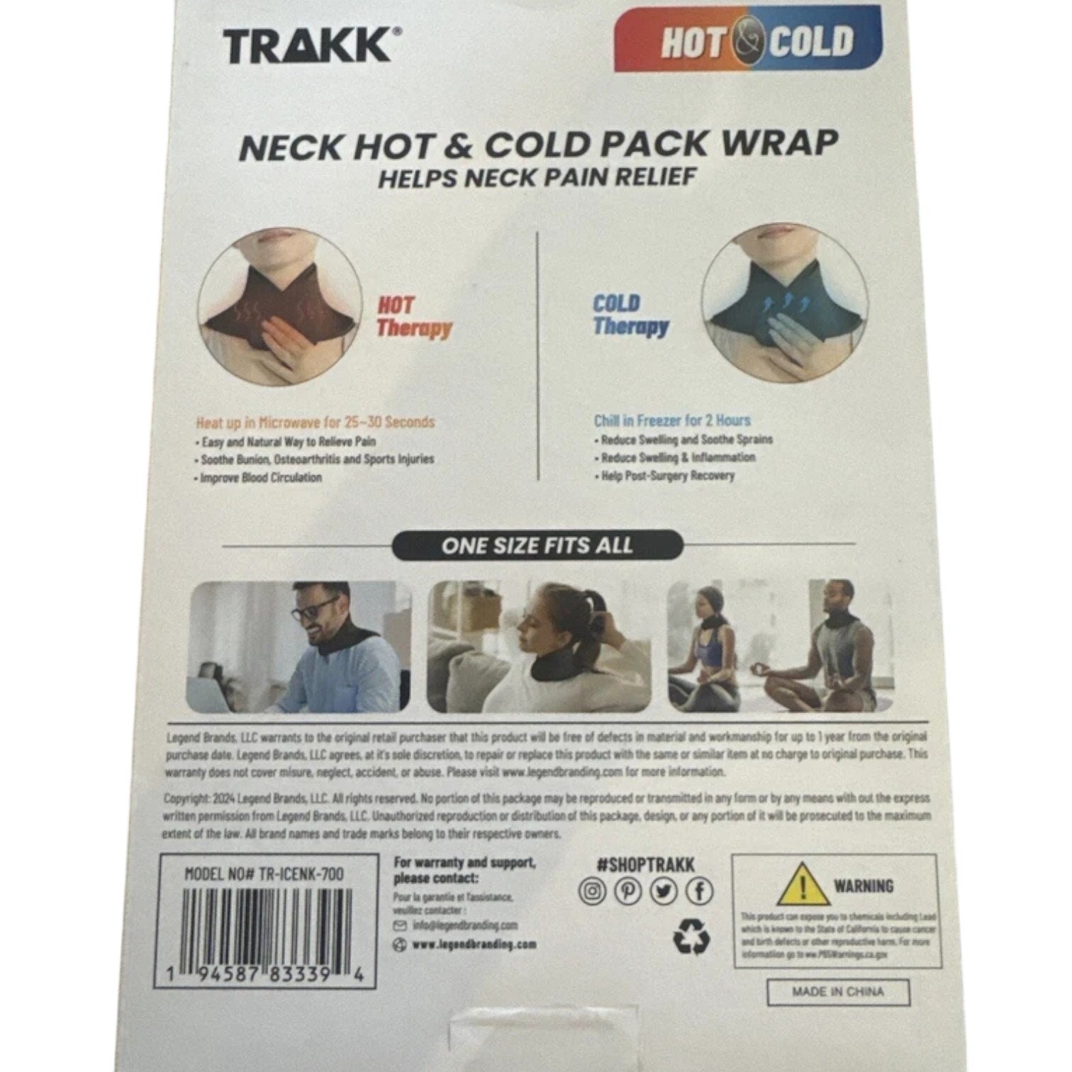 TRAKK reusable neck wrap designed for hot or cold therapy. Black in color, flexible and contoured to fit comfortably around the neck. Ideal for relieving muscle tension, inflammation, and stiffness. Can be microwaved for heat or frozen for cold application. Made from soft polyester/spandex blend. UPC 194587833394 confirms authenticity. Suitable for daily use and recovery routines.