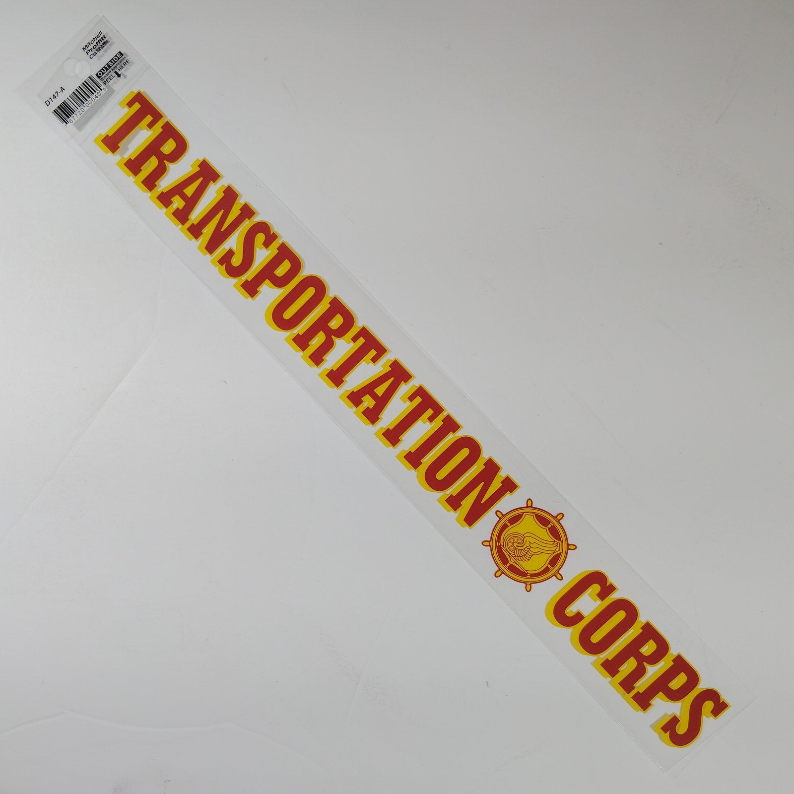 This 15.5" x 2" vinyl rear window cling features bold yellow "Transportation Corps" lettering with red outline and the official U.S. Army Transportation Corps insignia — a winged wheel within a ship’s wheel. Made by Mitchell Proffitt Co., this military decal is designed for outside window application and includes peel‑back instructions. Ideal for veterans, active duty personnel, and military supporters.