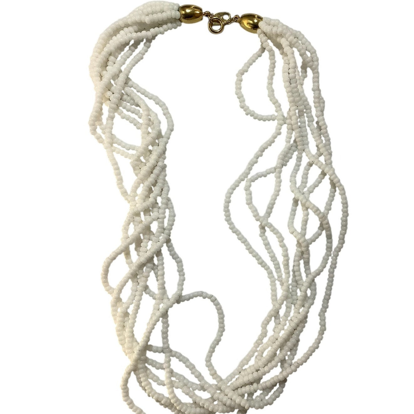 The vintage seed bead multi-strand necklace features a gold-tone spring ring clasp.