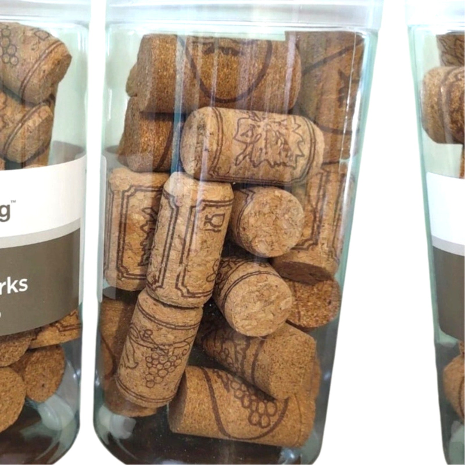This Trueliving set includes three jars of straight wine corks featuring assorted decorative designs. Ideal for crafting, décor projects, DIY displays, vase fillers, or replacement corks, each jar contains clean, unused corks with consistent sizing and detailed patterns. The combined net weight is 12.6 oz, offering a generous supply for creative projects. New and unused.