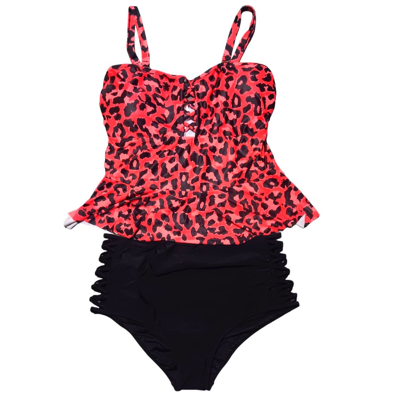 Two Piece Bathing Suit Peplum Tankini Tops High Waisted, Red Leopard, 22 Plus