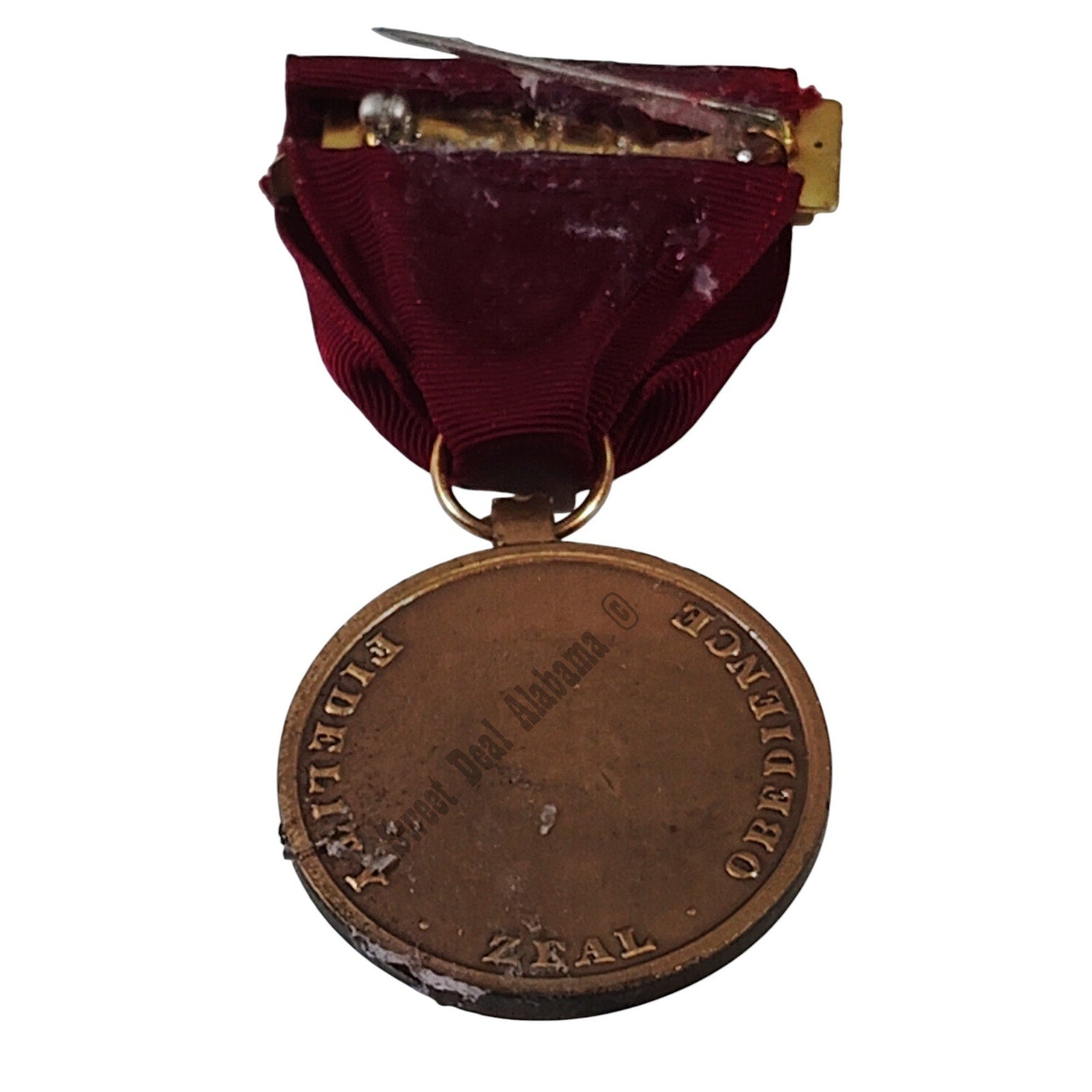 Measuring 1-5/16 inches in diameter and 3 inches in overall height, this medal features a pinback design for secure attachment. The obverse side displays a bronze medallion with an eagle perched on a fouled anchor, encircled by the inscription "FIDELITY ZEAL OBEDIENCE," symbolizing the core values of the Navy. The reverse side is often blank, allowing space for engraving the recipient's name or service details.