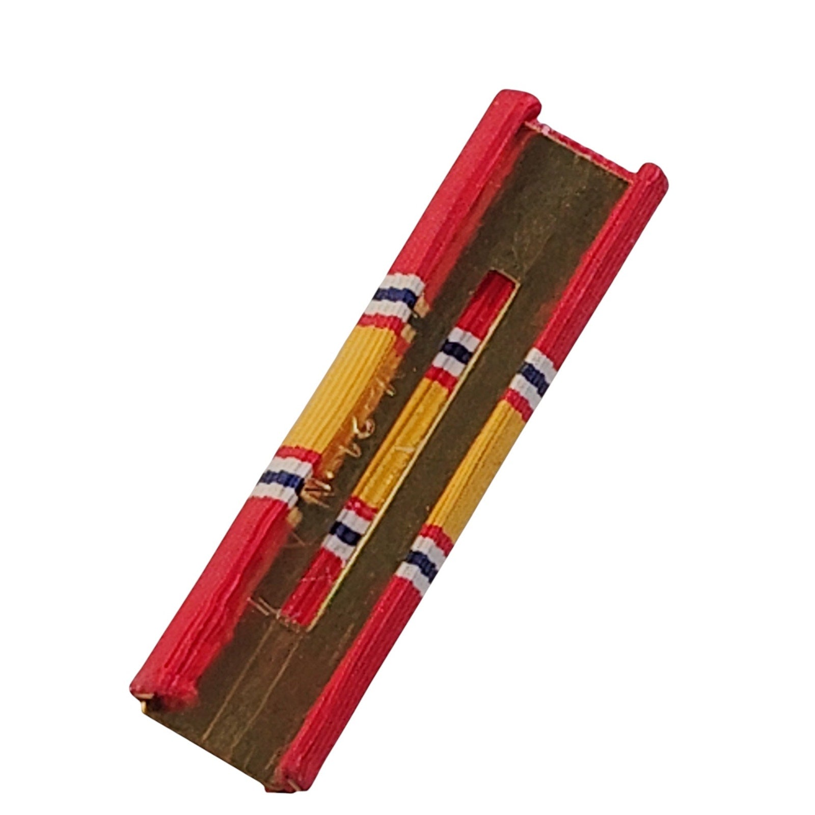 The ribbon features a central golden yellow stripe bordered by wide red stripes and narrower white and blue stripes on each end, symbolizing patriotism and readiness to defend the nation. It’s a simple yet impactful design with a timeless message.