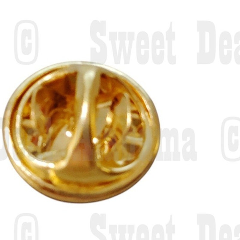 Includes butterfly clutchback(s) for secure fastening. The butterfly clutch is a small, metal clasp that grips the pin’s post, ensuring it stays in place on hats, jackets, or bags. This design allows for easy attachment and removal while keeping the pin firmly secured.