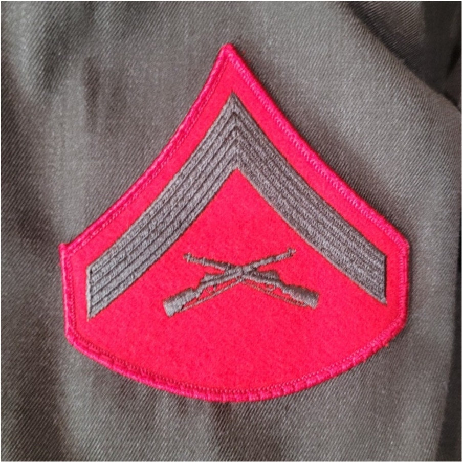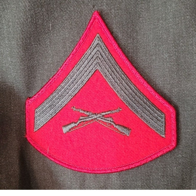 Authentic U.S. Marine Corps enlisted service dress coat in Shade 2212 gabardine green, size 41 Short. Constructed from a durable polyester/wool blend with rayon twill quarter lining. Single-breasted design with button front closure, roll collar, belt loops, and shoulder straps. Includes original belt and flap pockets. NSN 8405-01-279-5626 confirms military-grade authenticity. Lance Corporal insignia applied. Excellent pre-owned condition with no rips or stains. Ideal for collectors, reenactors, or formal display.