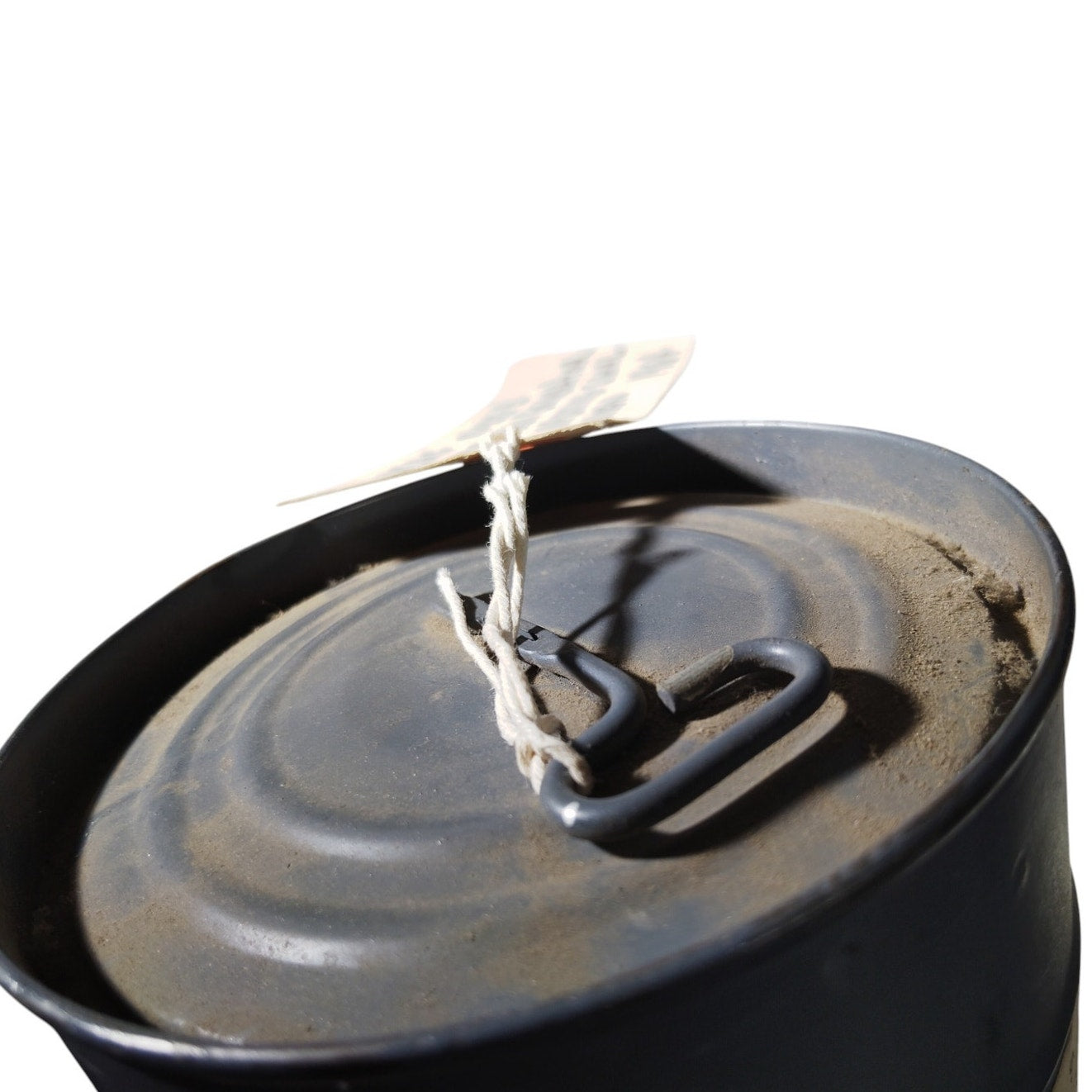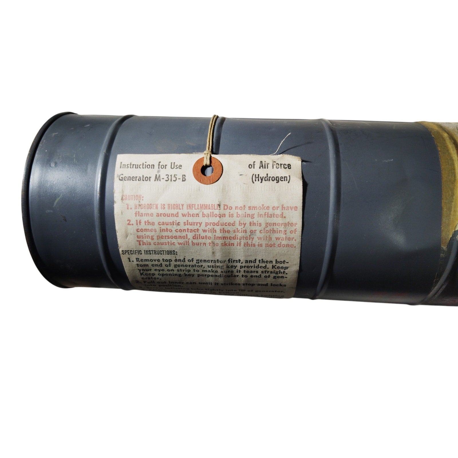 Original U.S. Navy M-315-B hydrogen generator kit, manufactured December 1964, used for inflating meteorological and observation balloons. This sealed metal cartridge contains one hydrogen-generating canister, two check valves, two binding wires, tape, and cement—designed for use with Navy gas masks including ND Mark IV and NDO Mark I.