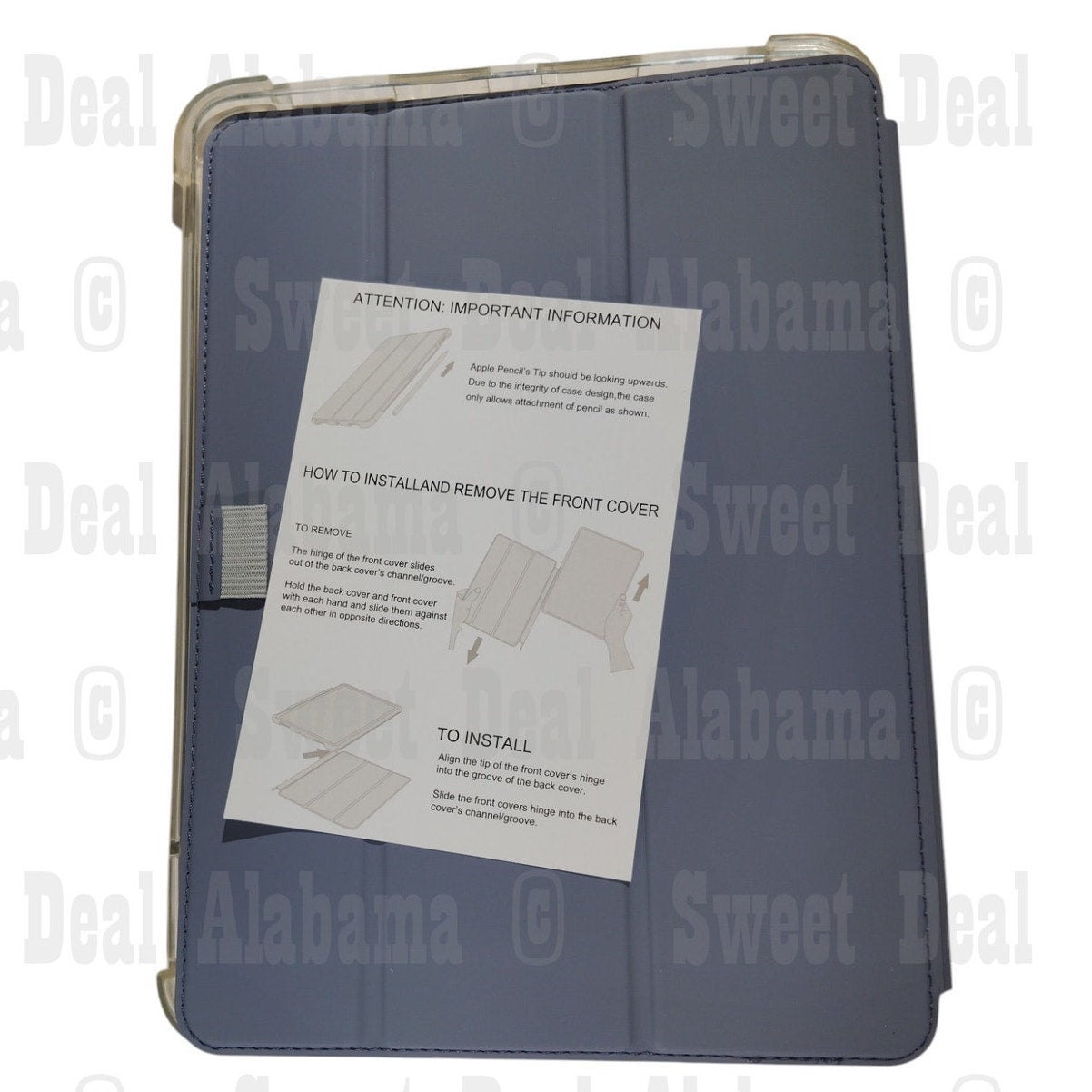The case includes installation instructions, emphasizing the correct placement of the Apple Pencil and the sliding mechanism for attaching and removing the front cover.