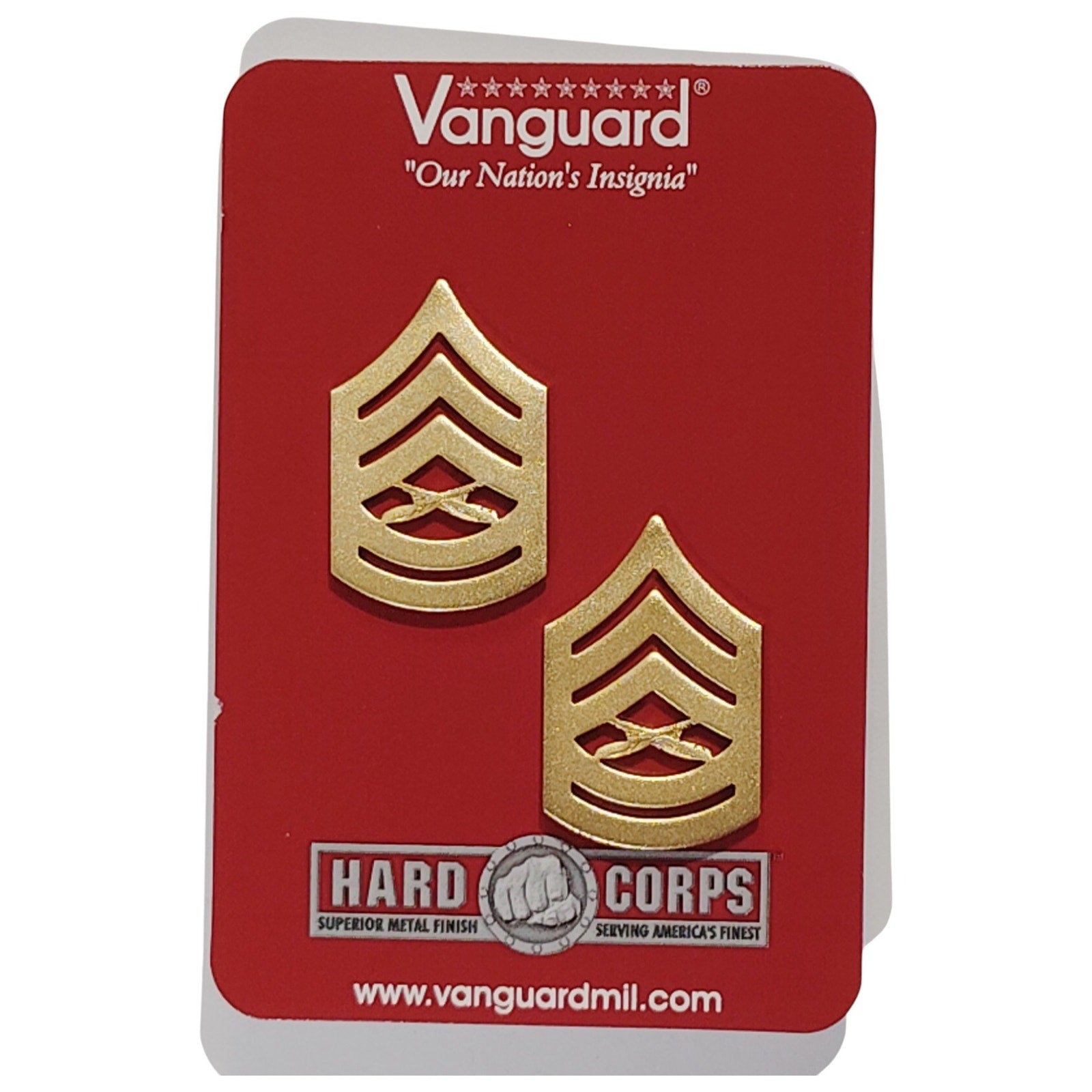 Regulation U.S. Marine Corps Gunnery Sergeant (E-7) chevron insignia in satin gold finish. Measures 7/8 inch by 1-1/4 inch. Features the classic three stripes over two rockers with crossed rifles. Designed for wear on dress and service uniforms. Manufactured by Vanguard Industries to meet military specifications. Individually packaged. Made in the USA.