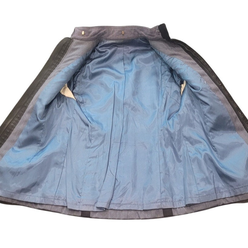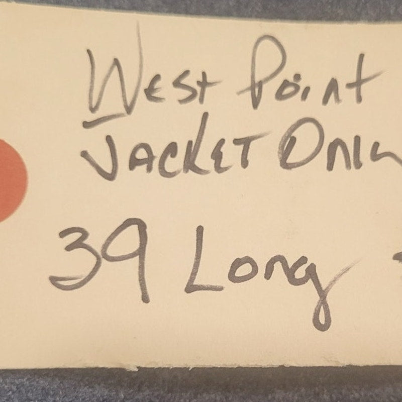 This vintage West Point cadet jacket, estimated to date from the 1950s based on its construction and style, is a classic example of mid-century U.S. Military Academy attire. Sized 39L, it features a gray wool blend body with black trim along the collar, cuffs, and front closure. The interior is lined in light blue, and the jacket is free of insignia or tailoring labels. Its clean lines and traditional cadet cut reflect the formal standards of West Point uniforms during the mid-20th century. Offered as-is, without trousers or accessories, this piece is ideal for collectors of military academy memorabilia or vintage uniform enthusiasts. Its preserved condition and historical relevance make it suitable for display, reenactment, or restoration.