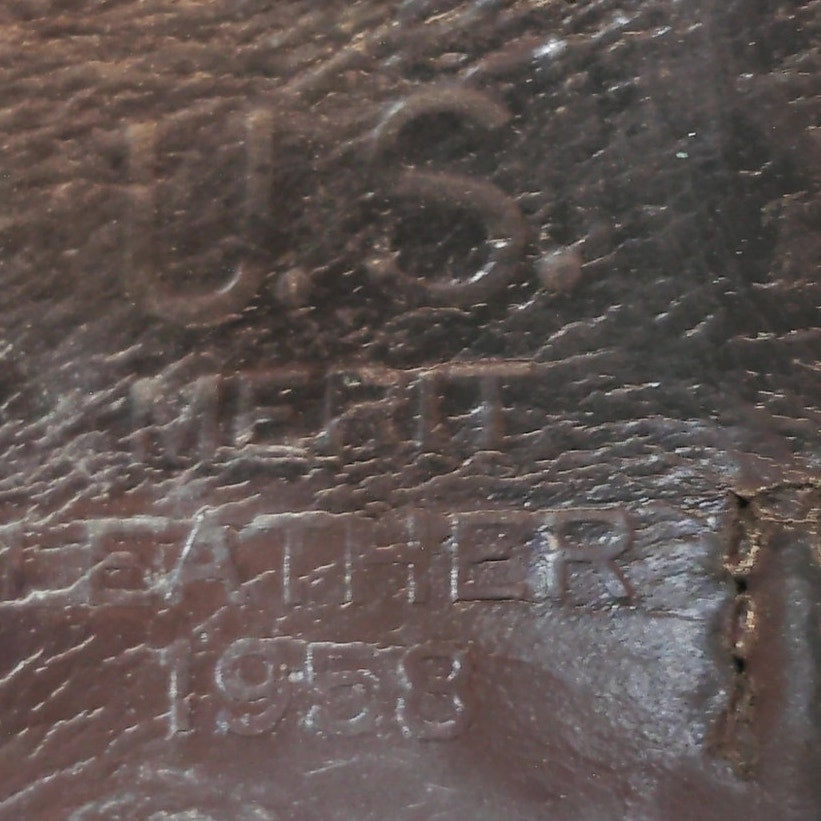 - Markings: “US” front stamp; “Merit Leather 1958” rear stamp