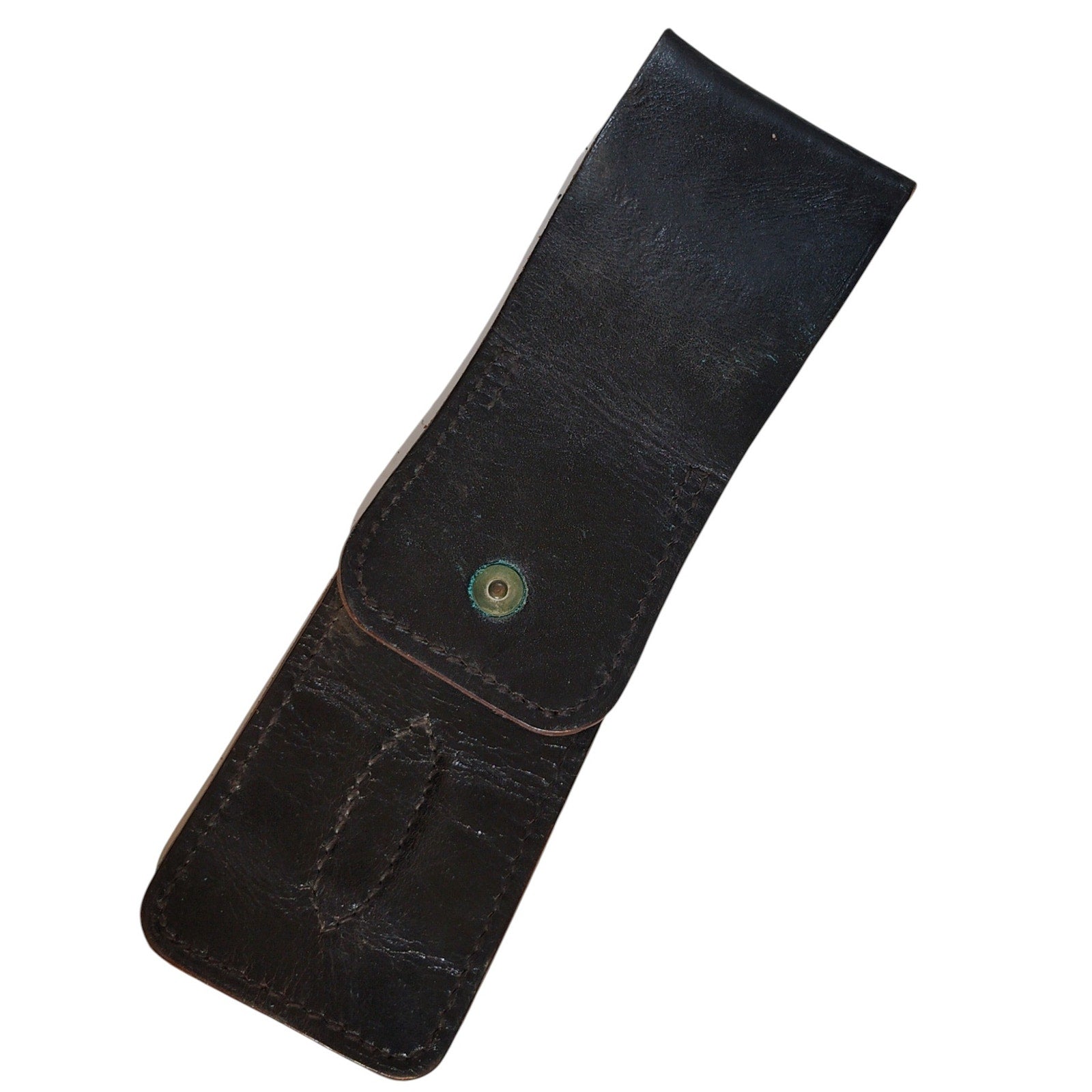 Authentic U.S. Military Police baton/nightstick holster manufactured by Merit Leather in 1958. Constructed from thick black leather with reinforced stitching, this Cold War-era holster was designed to carry a standard MP billy club or nightstick. Measures approximately 3″ wide × 7″ tall when folded, and 10-1/2″ × 3″ when opened.