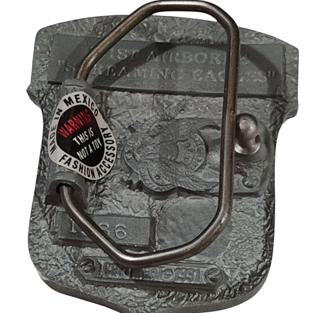 The Vintage 1991 101st Airborne Screaming Eagles Belt Buckle is a collectible piece that celebrates the legacy of the 101st Airborne Division, famously known as the "Screaming Eagles." Measuring 2-3/8 inches in height and 1-7/8 inches in width, this buckle is crafted from durable cast metal materials and features intricate detailing of the division's emblem.