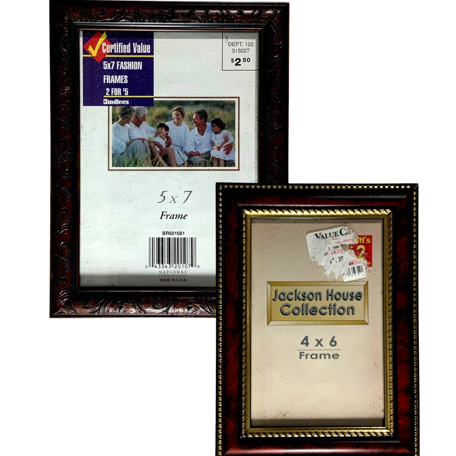 The Vintage 1999 NIP Frames set includes two picture frames, one for 4" x 6" photos and another for 5" x 7" photos, both in brown colors. Here are the details: