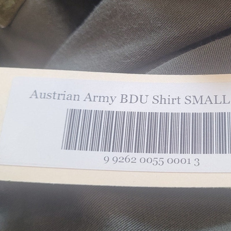 This authentic vintage Austrian Army BDU (Battle Dress Uniform) shirt is sized XS (Austrian 39 / U.S. 15" neck) and features a classic olive green color. Made from a durable 50% polyester / 50% Baumwolle (cotton) blend, it includes military-style epaulets, reinforced cuffs, and a full button-up front. A standout feature is the original embroidered Bundesheer patch sewn onto the sleeve, depicting the Austrian double-headed eagle with shield and the words “ÖSTERREICH BUNDESHEER.” This insignia confirms its affiliation with the Austrian Federal Army and adds provenance for collectors and enthusiasts. Issued during the Cold War era, this shirt reflects the rugged utility and national pride of Austrian military gear.