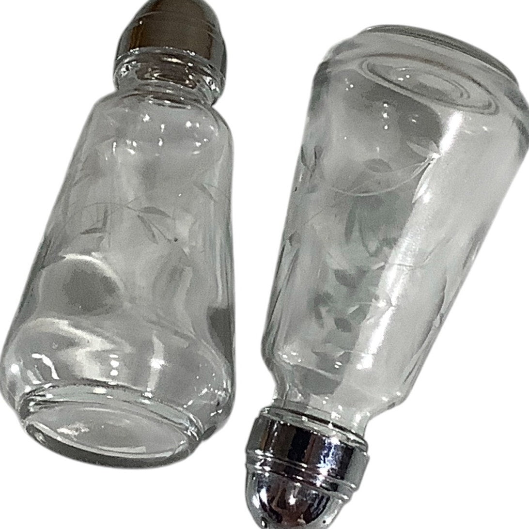 Vintage Crystal Salt and Pepper Shakers, Etched Floral and Vine Design