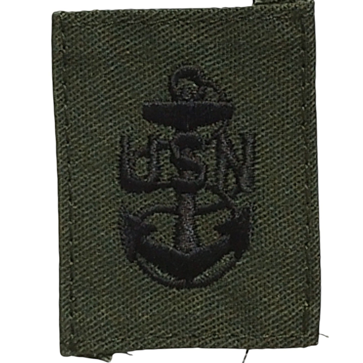 Official U.S. Navy E-7 Chief Petty Officer (CPO) cap device featuring the iconic fouled anchor with “USN” initials, embroidered in black thread on olive drab green (ODG) twill. This subdued version is designed for tactical wear on utility covers, BDUs, and coveralls, especially in field or joint-service environments. Manufactured by Vanguard USA, a certified supplier of military insignia, and identified by UPC: 024768068195. Patch measures 1-1/2" x 1-7/8", regulation size for subdued headgear applications.
