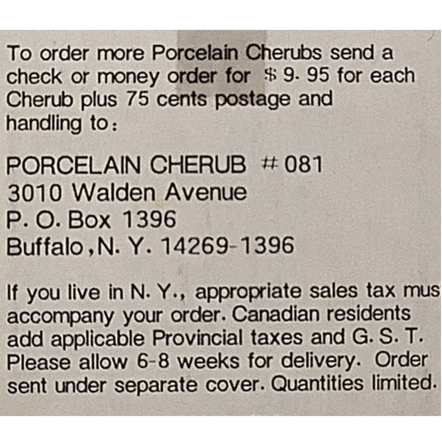 Since the only reordering option is stated to send a check on Money Order to the address and the fact that I could not locate exact cherub with google photos, I am assuming this is from back in the lates 1970's or early 1980's when mail order was the most common.
