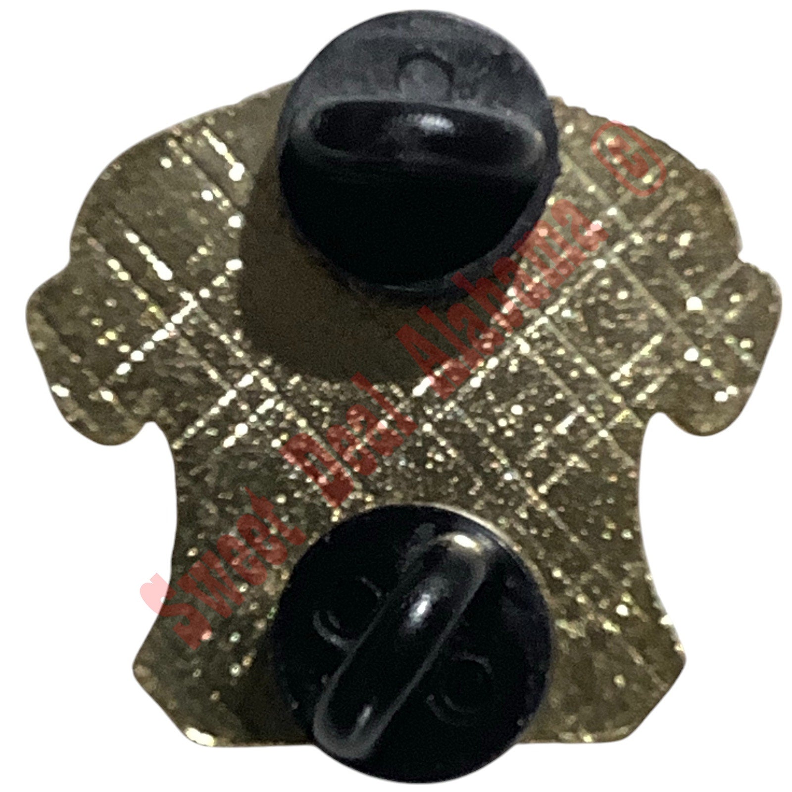 The pin measures 1-1/8 inches in height and 1-1/8 inches in width. It features a bold shield design, divided into two sections: