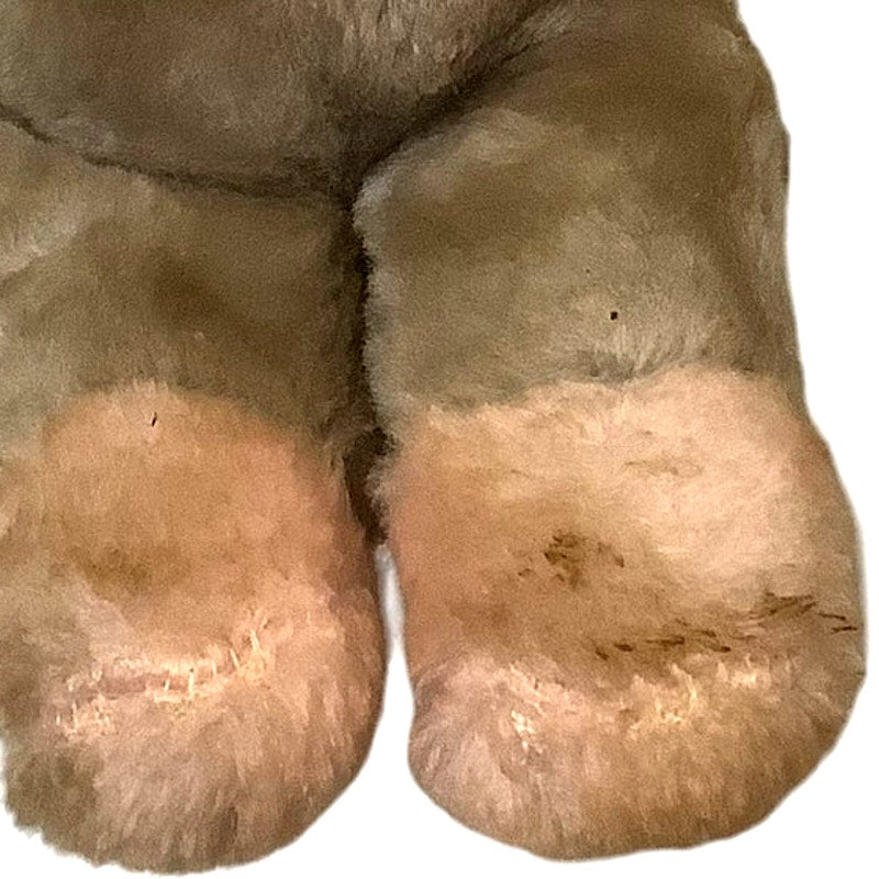 The stitching, eyes, nose are all firmly in place with no flaws found upon inspection of all the stitching and still has its whiskers intact, it came to us in a plastic bag where it has been stored, probably for many years. But there is a bit of dirty look, maybe age, found in the pink area of the feet.