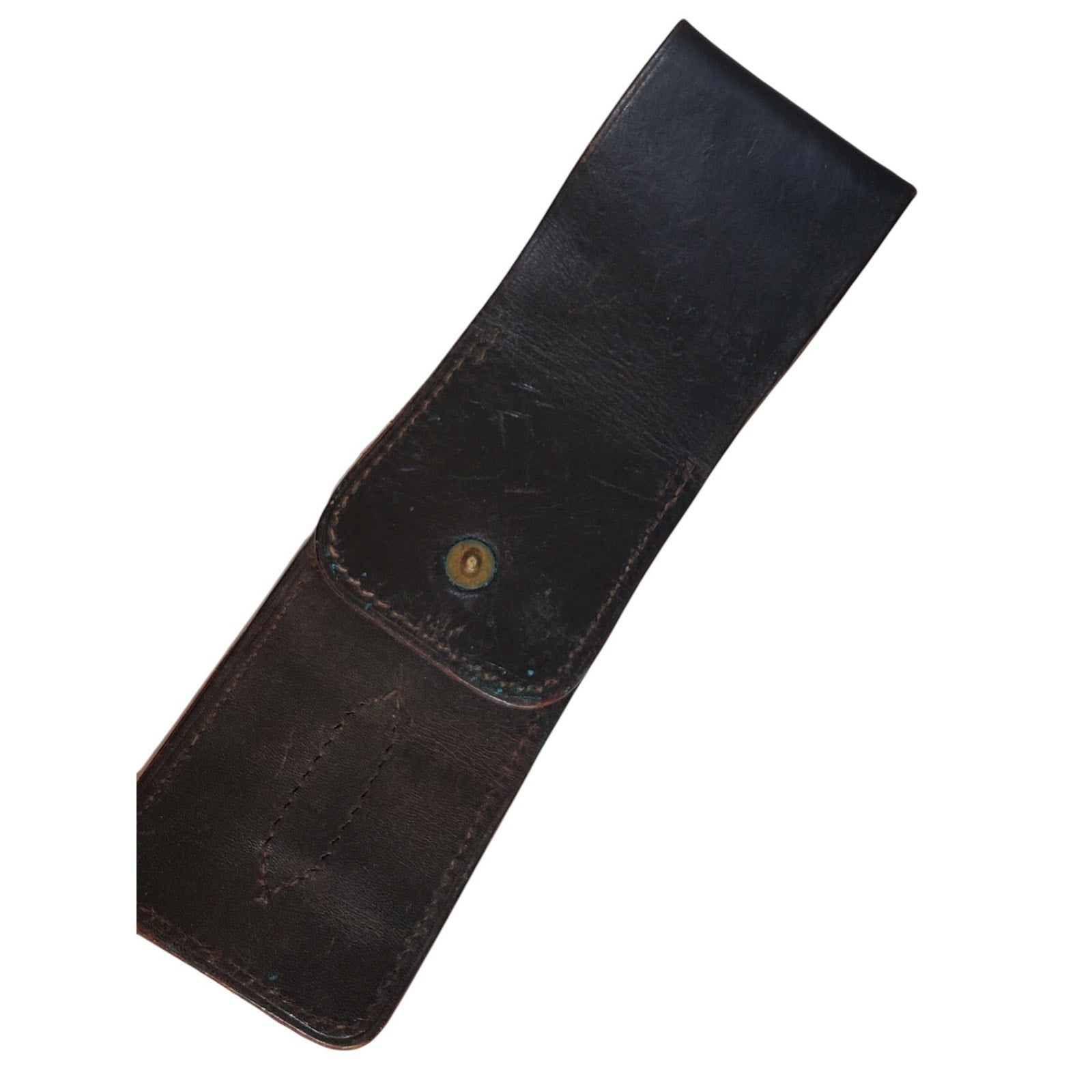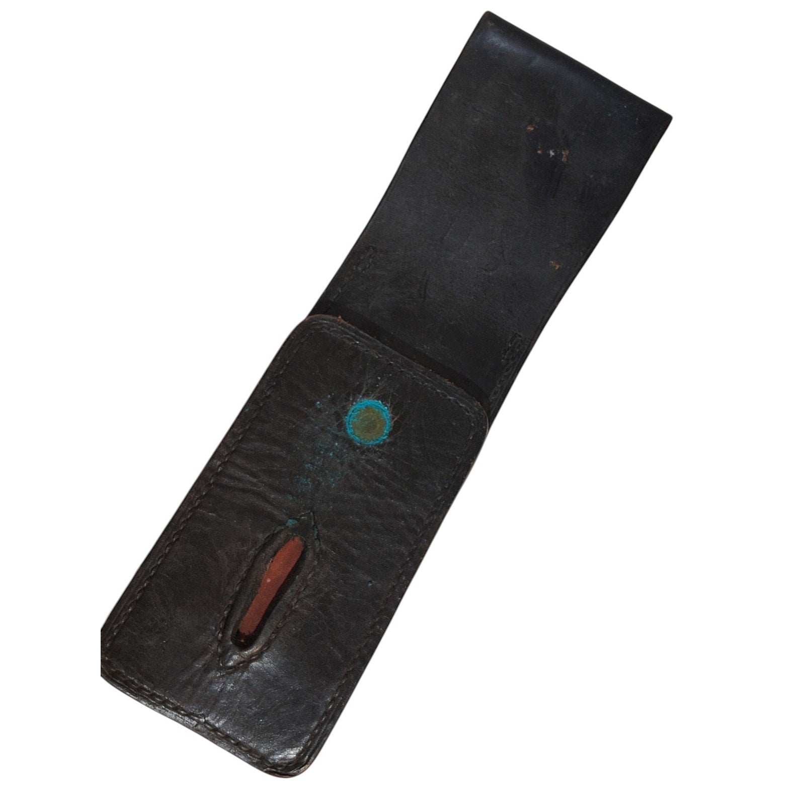 Original U.S. Military Police baton/nightstick holster manufactured by ALPCO in 1957. This Cold War-era holster is constructed from thick black leather with reinforced stitching and was designed to carry a standard MP billy club or nightstick. Measures approximately 3″ wide × 7″ tall when folded, and 10-1/2″ × 3″ when opened.