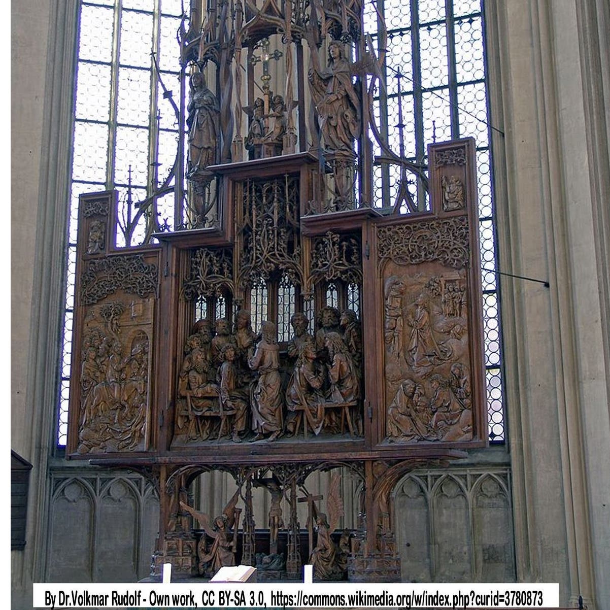 Its western gallery contains the famous Holy Blood altarpiece of the Würzburg wood carver Tilman Riemenschneider, carved 1500–1505. The altar includes scenes of the entry into Jerusalem (right wing), Lord's Supper (shrine) with Judas as central figure and the Mount of Olives (left wing).