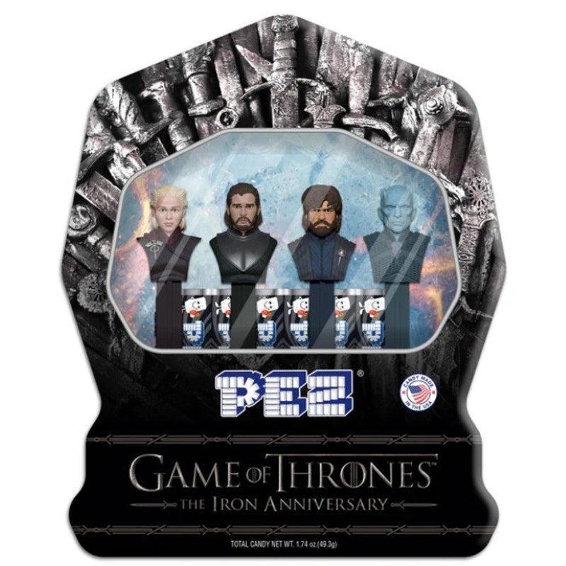 The Warner Bros. Game of Thrones Tin is a retired collectible featuring four PEZ dispensers inspired by the iconic characters from Game of Thrones. This set includes Daenerys Targaryen, Jon Snow, Tyrion Lannister, and the Night King, all packaged in a commemorative tin designed to resemble the Iron Throne. The tin also includes six rolls of Dragon Fruit PEZ candy, adding a thematic touch to the collection.