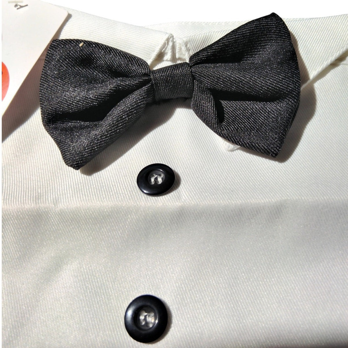 Formal pet suit from the Boots & Barkley Wedding Collection, size SM/MED for necks 12–16 inches. This three-piece white polyester set includes a bib with collar, black sateen bow tie, and two black buttons, plus two French cuffs with hook-and-loop closures and black button accents. UPC 042607807606.