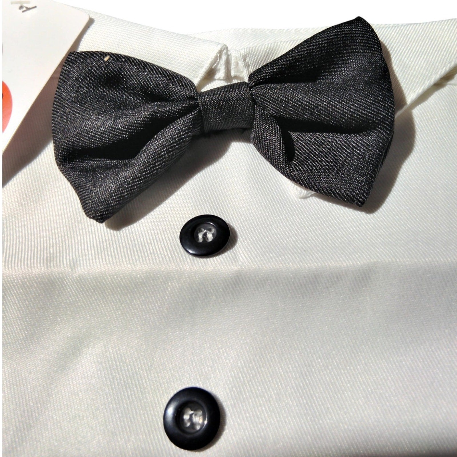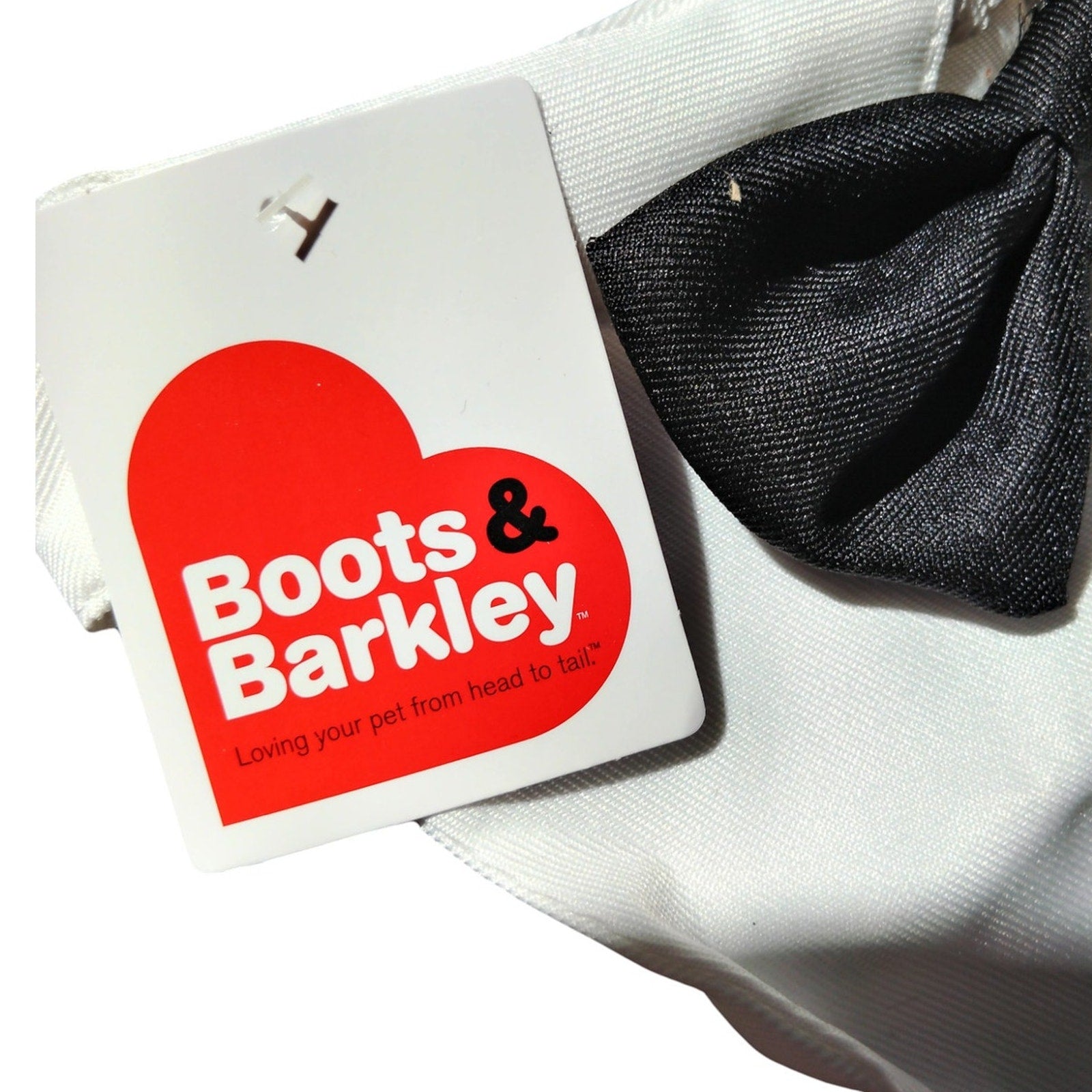 Formal pet suit from the Boots & Barkley Wedding Collection, size XXS/XS for necks 6–10 inches. This three-piece white polyester set includes a bib with collar, black sateen bow tie, and two black buttons, plus two French cuffs with hook-and-loop closures and black button accents. UPC 042607007600.