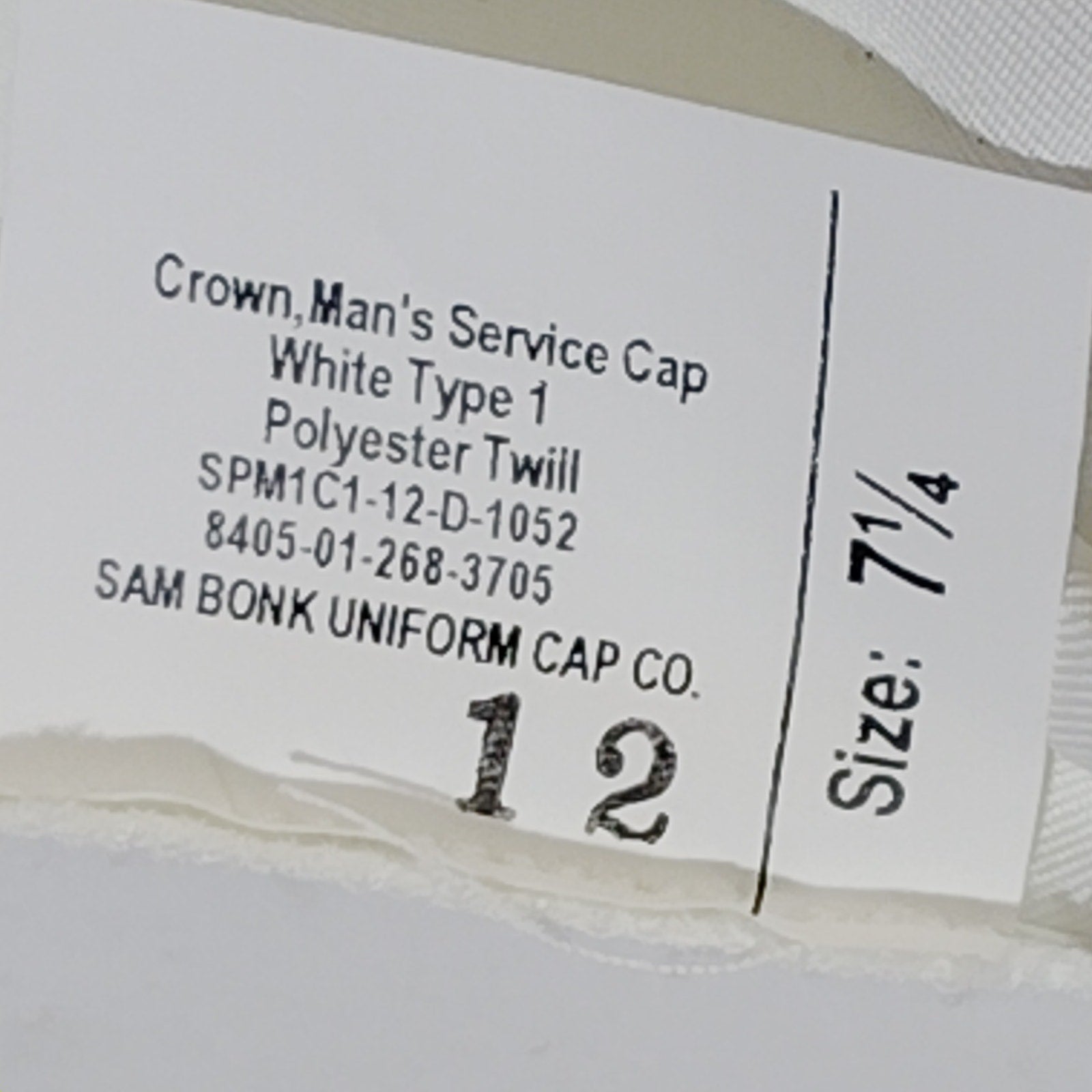 U.S. military issue white service cap crown, Type I, size 7-1/4, constructed from durable polyester twill. Manufactured by Sam Bonk Uniform Cap Co. under contract SPM1C1-12-D-1052, this crown meets MIL-C-18186D specifications and carries NSN 8405-01-268-3705. Designed to fit standard service cap frames, this removable crown is used in dress uniforms across Navy, Coast Guard, and ceremonial units. Crisp white finish with reinforced stitching and button attachment points. New old stock condition.