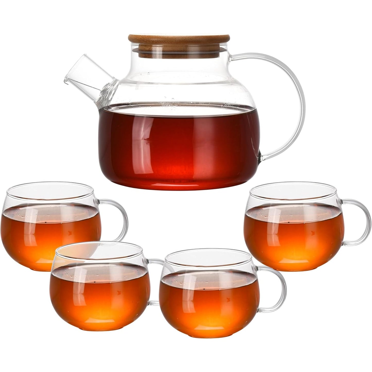 Whole Housewares Glass Teapot Set w/ Bamboo Lid + 4 Mugs | Microwave Safe