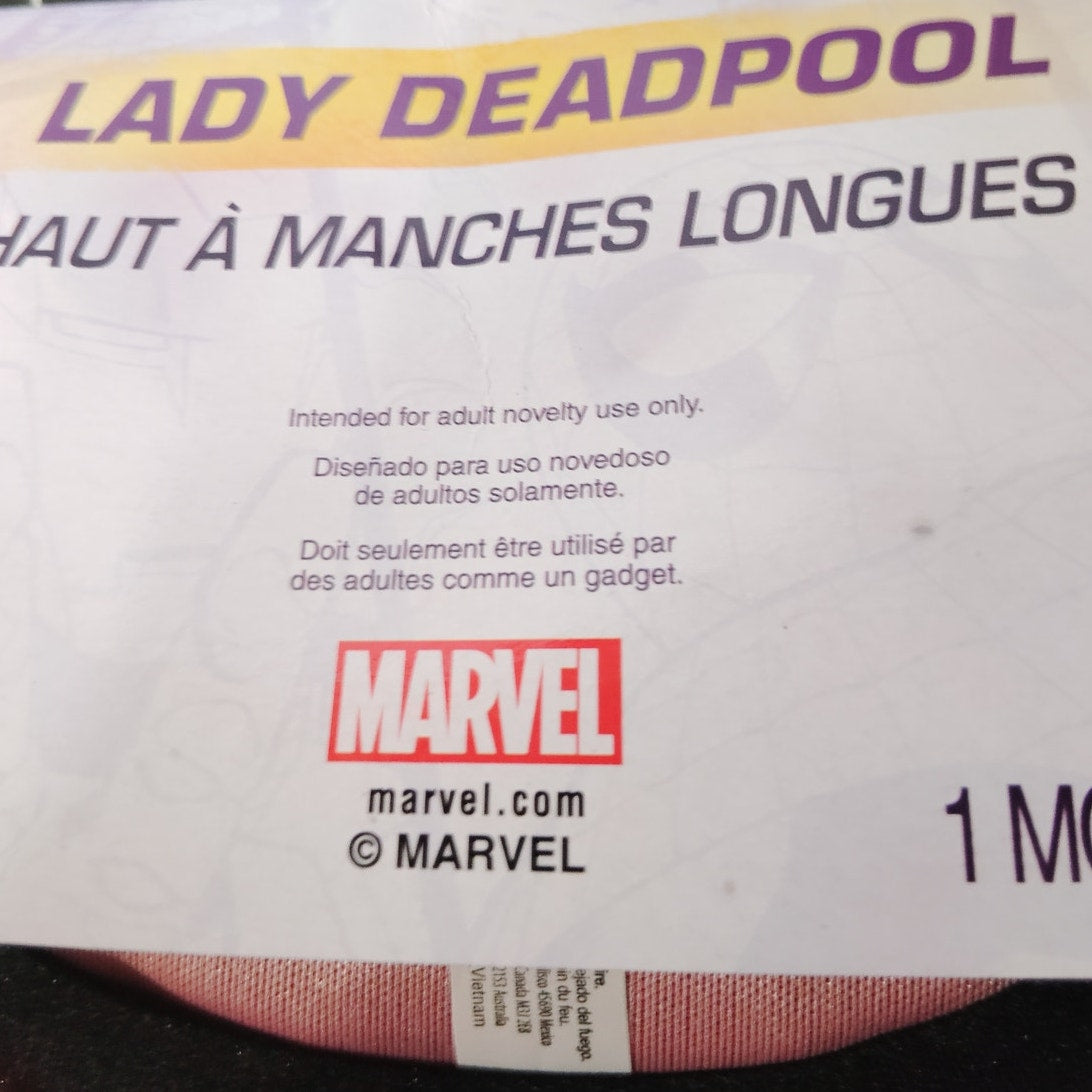 Official Women’s Deadpool costume shirt in red and black. Long-sleeve design with printed character detailing makes this an easy and comfortable outfit for Halloween, cosplay, or themed events. Size Small/Medium fits most women’s sizes in this range. New in original packaging with UPC 809801786768.