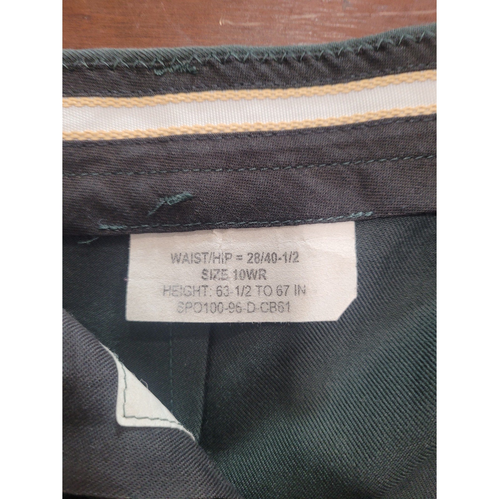 This listing is for a pair of U.S. Army women’s service uniform trousers, size 10WR (Women’s Regular), in Army Green Shade AG-489. Manufactured in the USA under contract SPO100-96-D-CB61, these trousers are constructed from a durable polyester/wool serge blend and were issued as part of the Army Class A “Green” uniform during the 1990s.