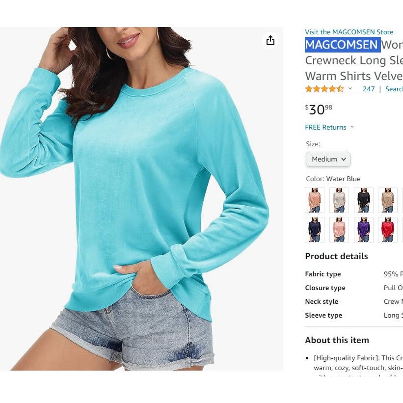 Women's Velour Casual L/S Shirt, Water Blue, Small, Velvet Top, Pullover, NWT