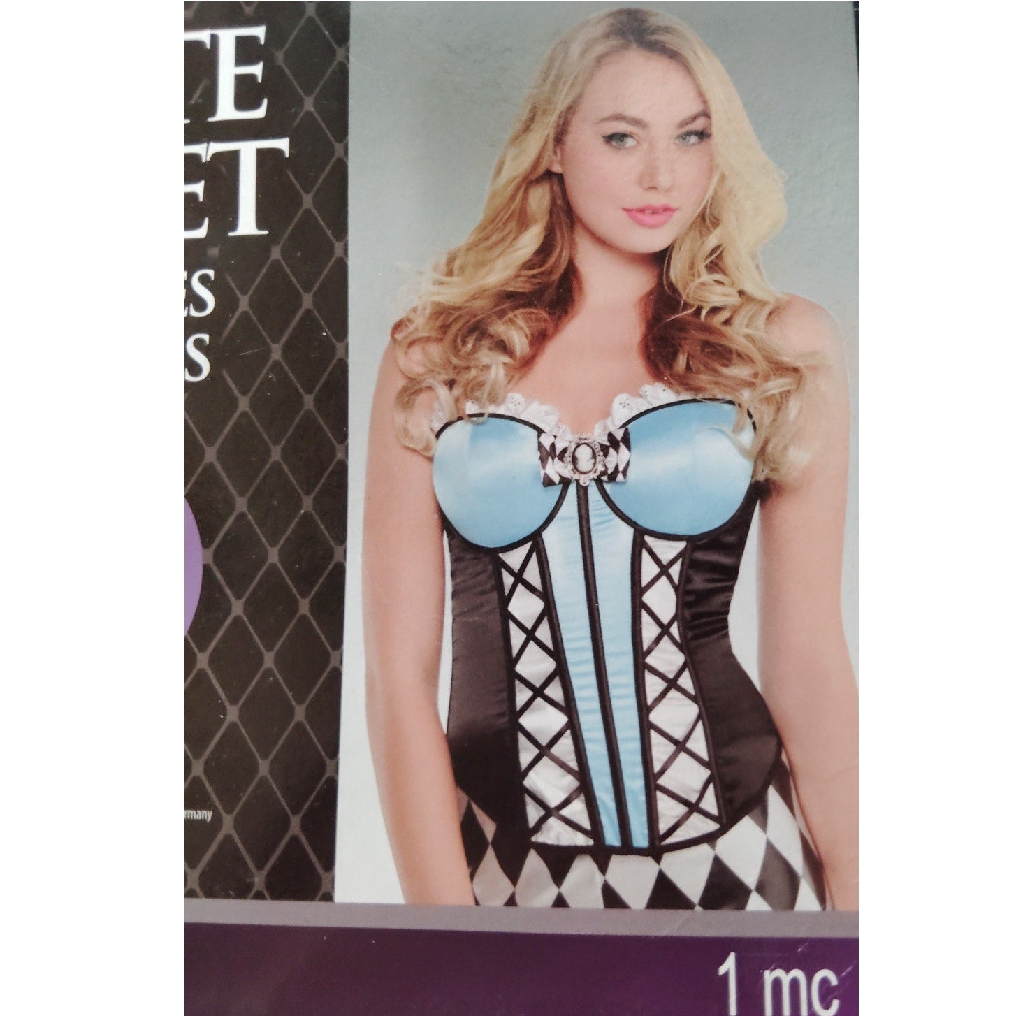 Step into a whimsical fantasy with this Wonderland-inspired Alice corset costume. Designed with a flattering bustier-style top in pastel blue and black accents, this outfit blends classic fairytale charm with a modern silhouette. Perfect for Halloween parties or themed events, the costume offers a structured fit and playful detailing that captures the essence of Alice with a fashionable twist.