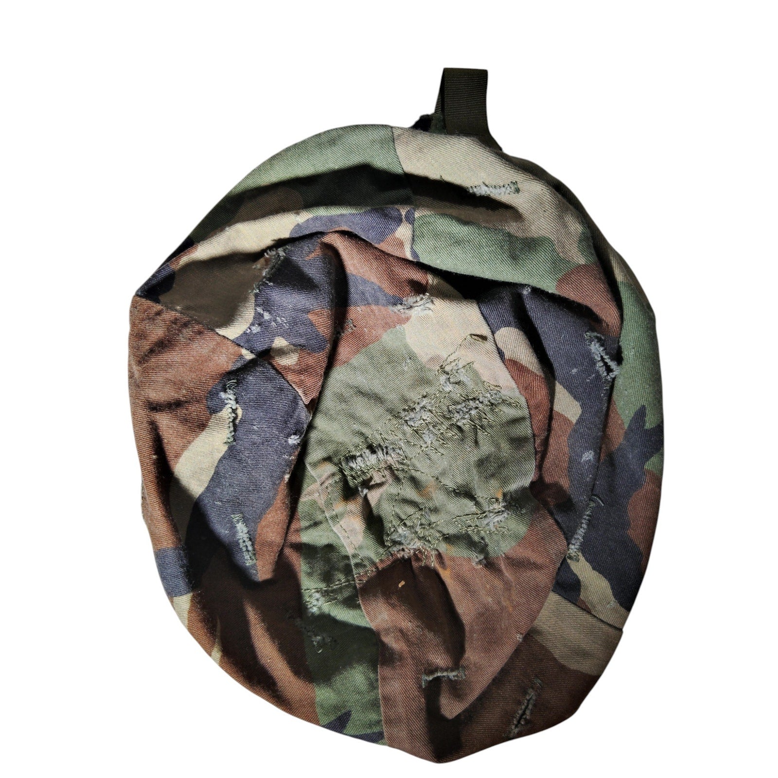 Original U.S. military Woodland camouflage helmet cover in good condition, with colors still vibrant and fabric showing minimal wear. Designed for use with the PASGT steel pot helmet, this cover features integrated hook-and-loop fasteners for secure attachment. The Woodland pattern—also known as M81—was the standard issue camouflage for U.S. Armed Forces from 1981 until phased out in the early 2010s. This cover was commonly deployed during Cold War operations.