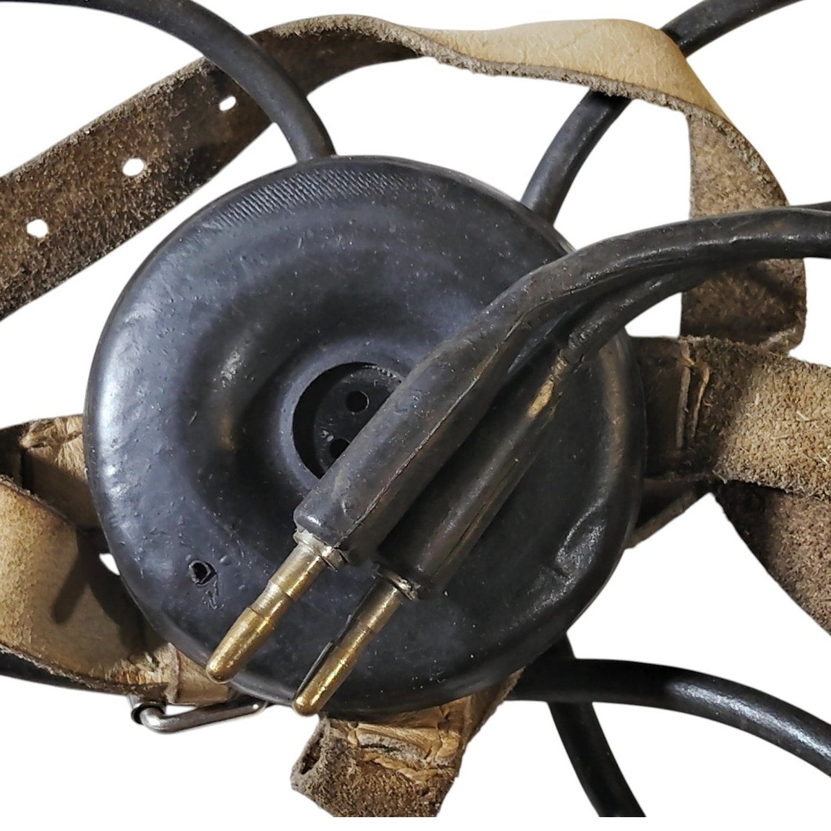 This authentic WWII-era plug-in radio headset features classic Bakelite earphone receivers, rubber sleeve cushions, and original leather or fabric head straps. Commonly issued to U.S. Army Signal Corps, USAAF, and Navy personnel, these headsets were used for field communications, aircraft operations, and armored vehicle intercom systems. The rugged design and vintage materials make it a prized collectible for WWII enthusiasts and radio historians.