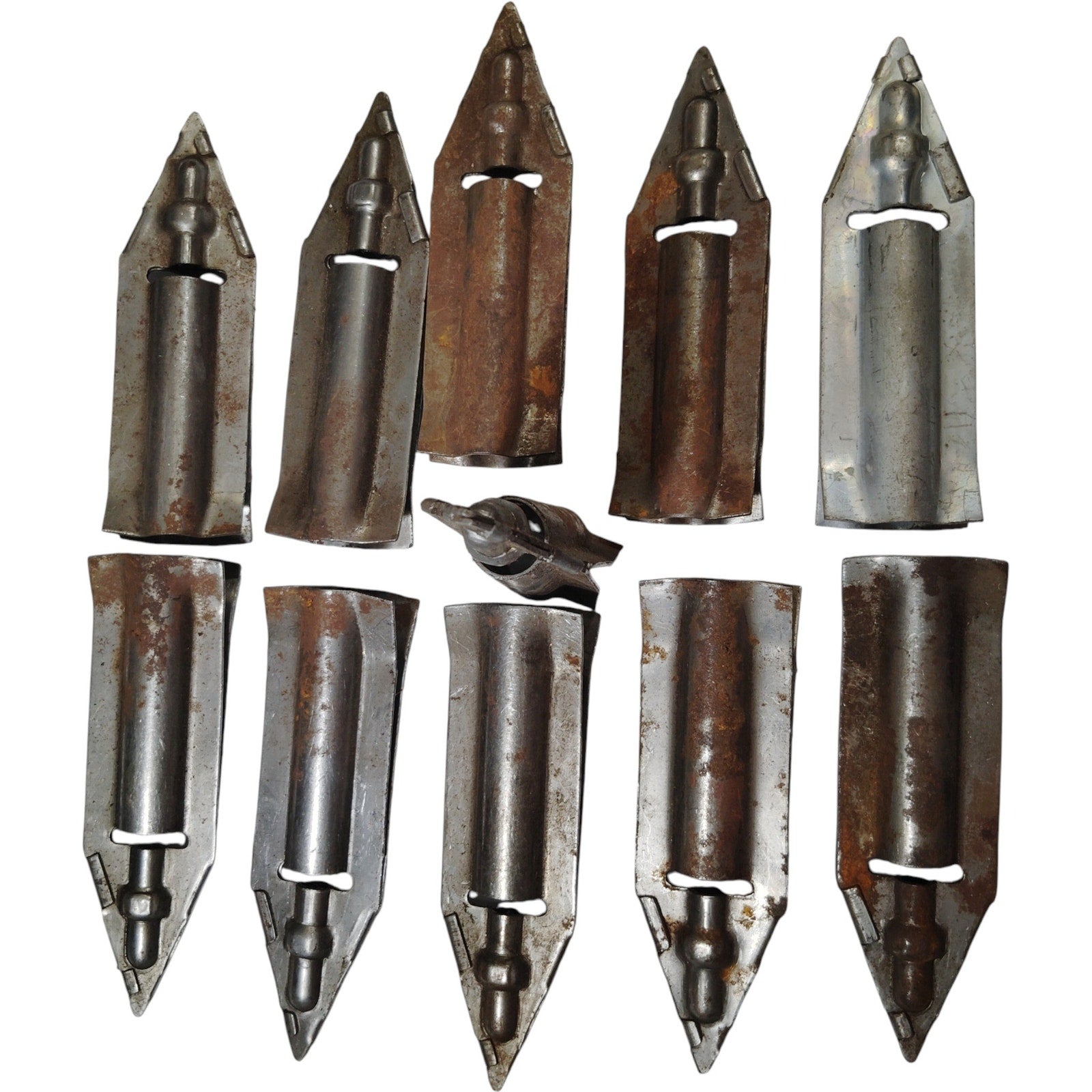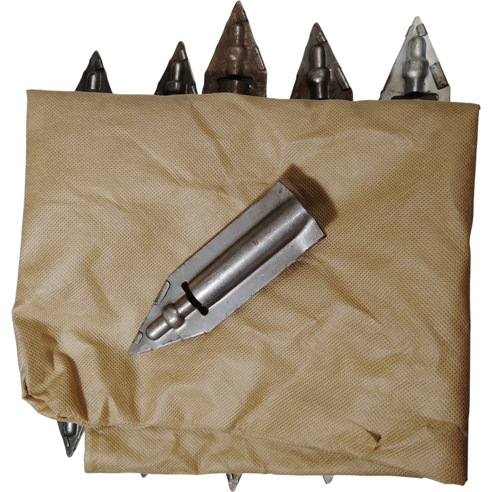 Lot of 11 original steel stakes from a WWII-era Type D-1 Airplane Mooring Kit, issued by the U.S. Army Air Forces for securing tactical aircraft in field conditions. These forged steel stakes were designed for anchoring gliders and light aircraft against wind displacement and terrain instability. Each stake features a pointed end for ground penetration and a loop or eyelet for rope or rod interface. This listing includes stakes only, accompanied by a non-canvas carry bag shown in the photos. All items are in used condition, with visible signs of age and service wear. Actual stakes and bag are pictured to show the exact items being sold.