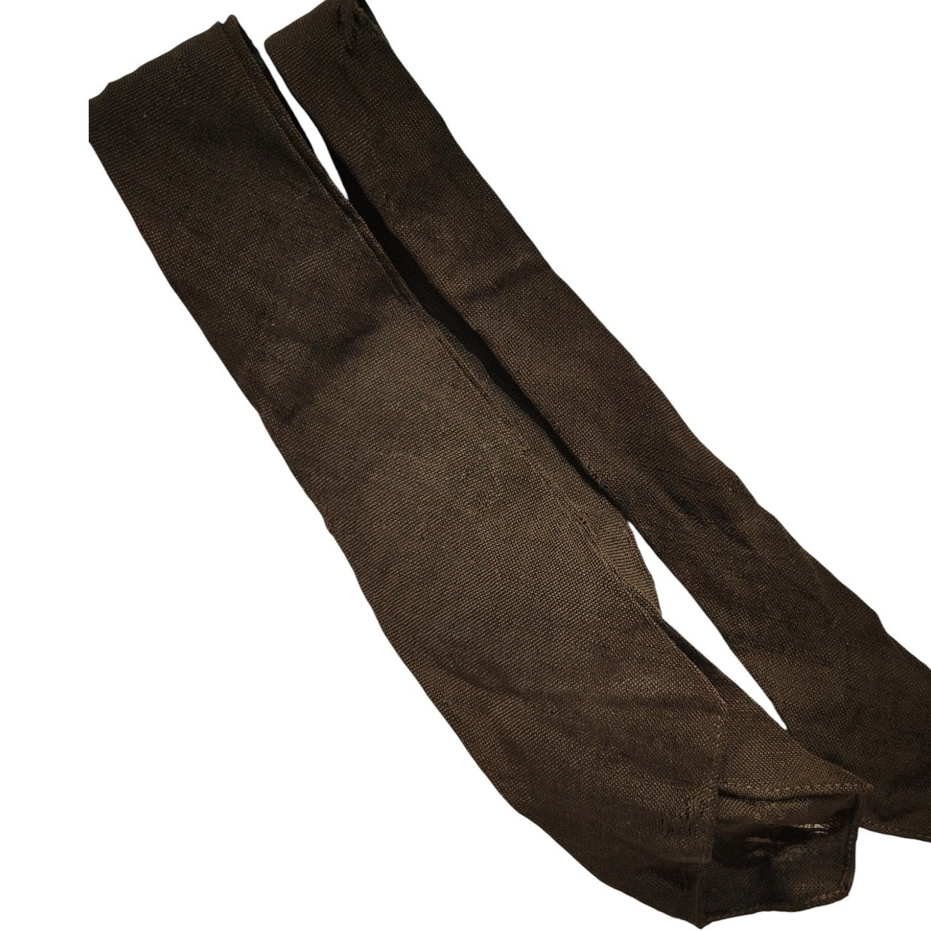 Original World War II-era U.S. Army enlisted necktie in olive drab green wool. Features a coarse weave texture and unfinished ends, consistent with wartime production standards. A classic uniform accessory from the 1940s, ideal for collectors, reenactors, or restoration of period-correct dress uniforms. Shows age wear appropriate to vintage condition.
