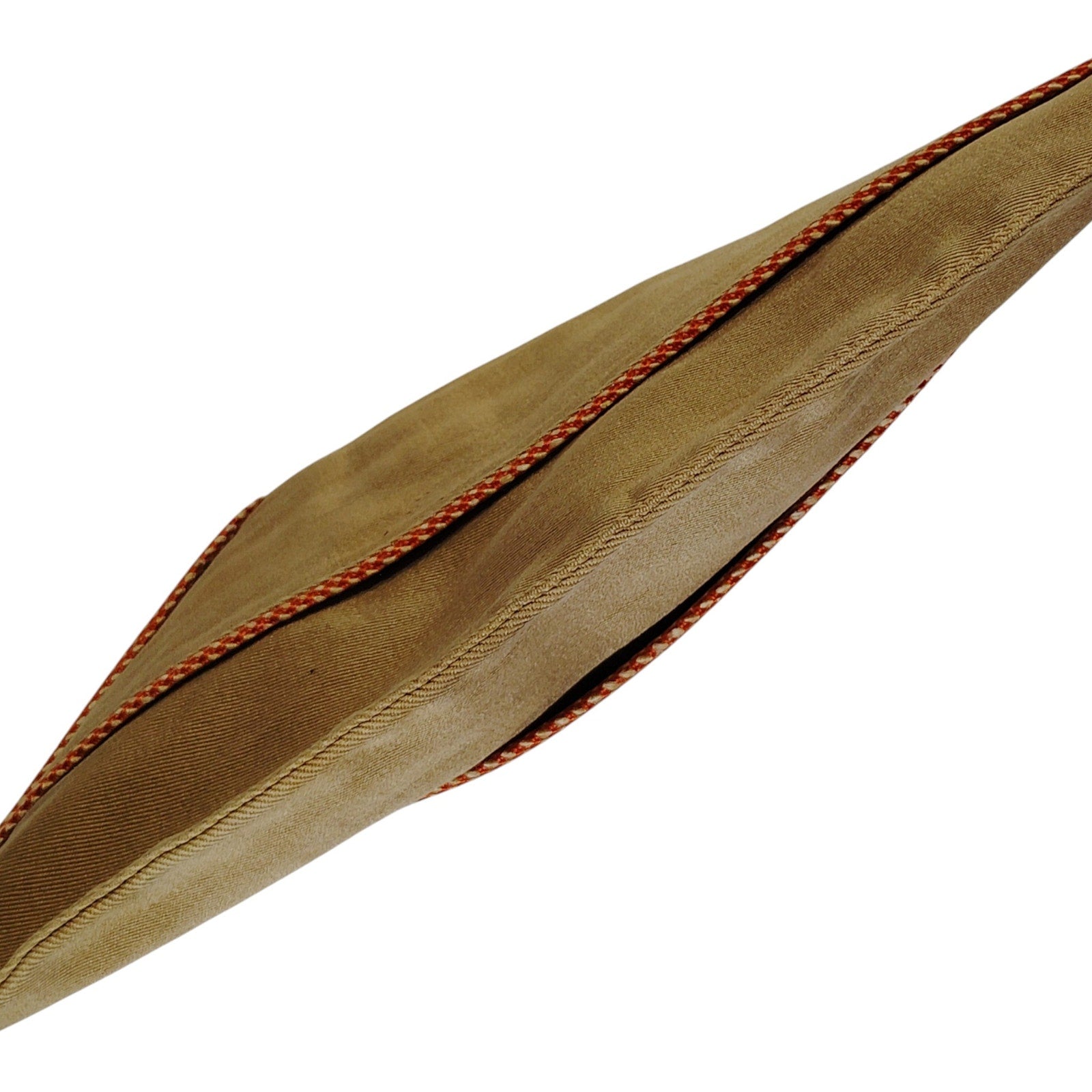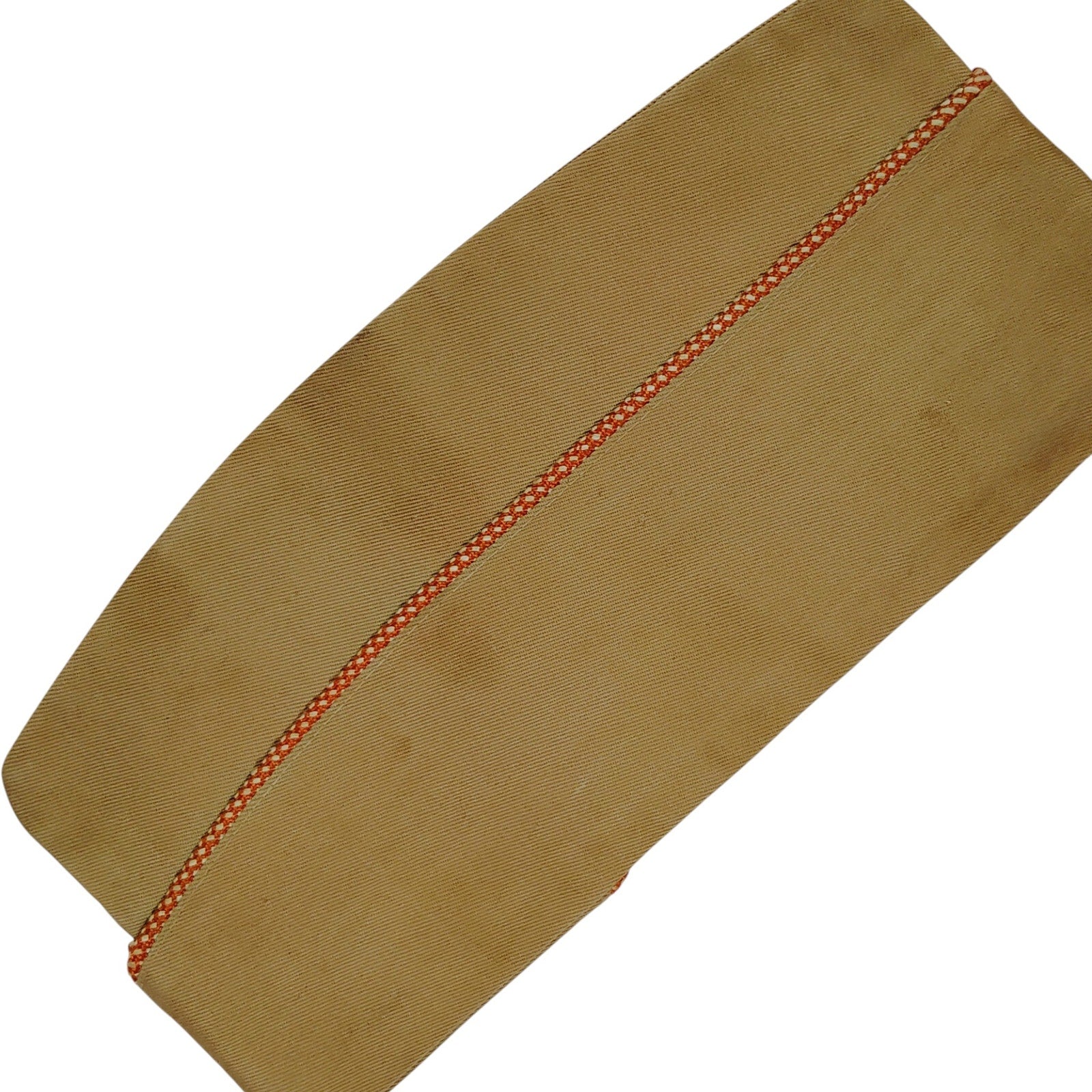 Original WWII-era U.S. military overseas garrison cap in khaki cotton, untagged, measuring 10-1/2" in length—approximately size 6-7/8. Features colored branch piping along the upper seam, indicating service affiliation (e.g., red for artillery, blue for infantry, gold for cavalry). Constructed in regulation wedge style with internal stitching typical of 1940s Army issue. No insignia or tags present. Fabric and cut align with summer service uniforms issued to enlisted personnel. Ideal for collectors, reenactors, or uniform restoration. Light wear consistent with age; no major defects.