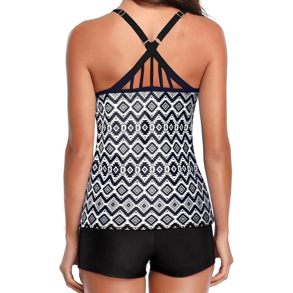 These two-piece swimsuits include tummy control tank tops with a strappy crisscross back design and modest boy shorts tankini bottoms.