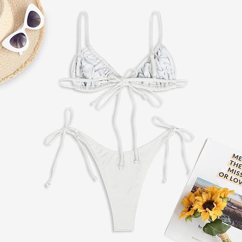 Features: Frilled trim, Textured Tie String bikini, drawstring strap, tie front and tie side, removable padded