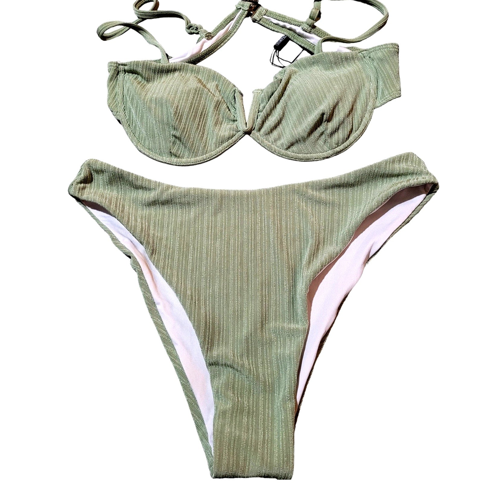 In a ribbed finish, this bikini features underwire bra with v-notched detail, while the high cut bottoms elongate your legs. Do not forget it for your next beach trip.